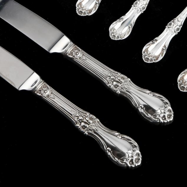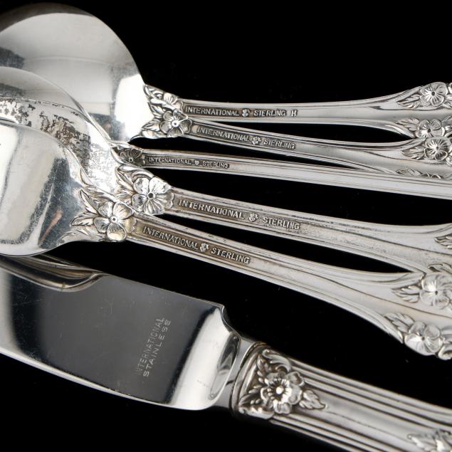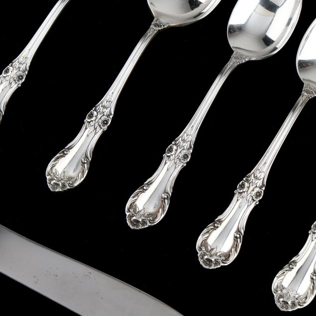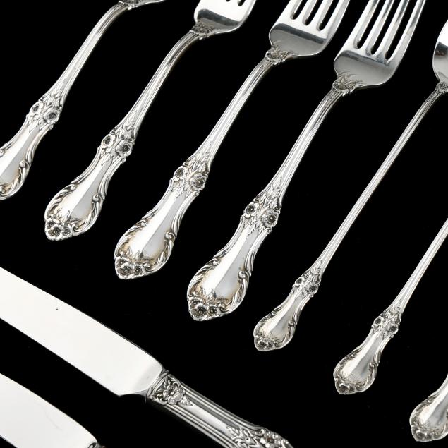 (18) pieces to include: (4) dinner knives (9 1/2 in.); (4) dinner forks (7 1/4 in.); (5) teaspoons (5 3/4 in.); (2) round bowl soup spoons; and (3) iced tea spoons. Not monogrammed.