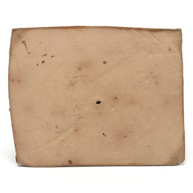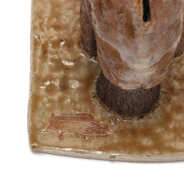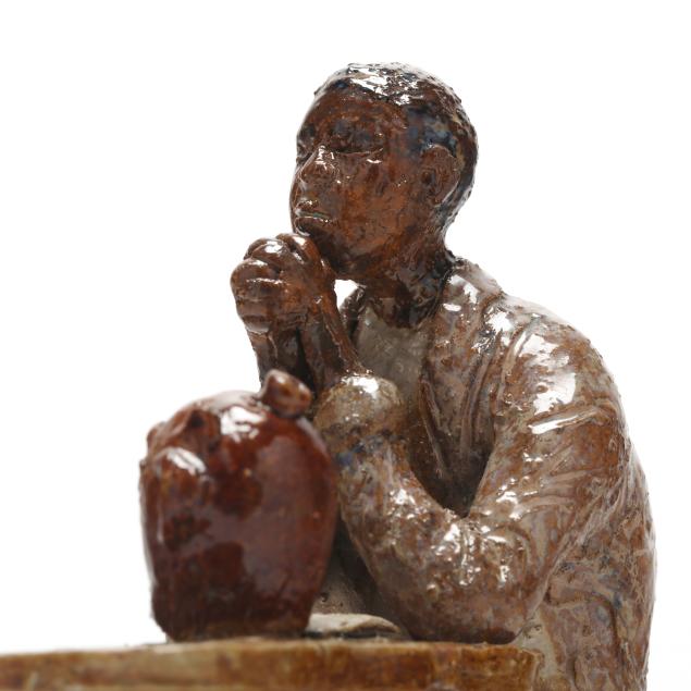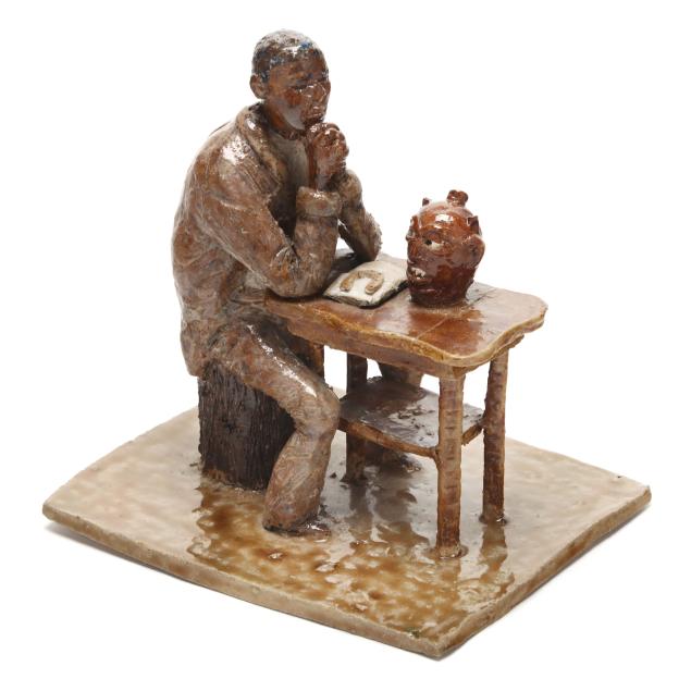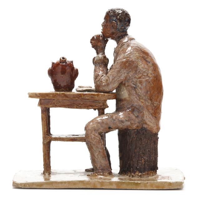 Late 20th century, glazed figurine featuring a man seated on a stump with arms resting in prayer, on a table with a horseshoe and face jug, initialed "EB" to base, the figure's back slotted for use possibly as a coin bank.