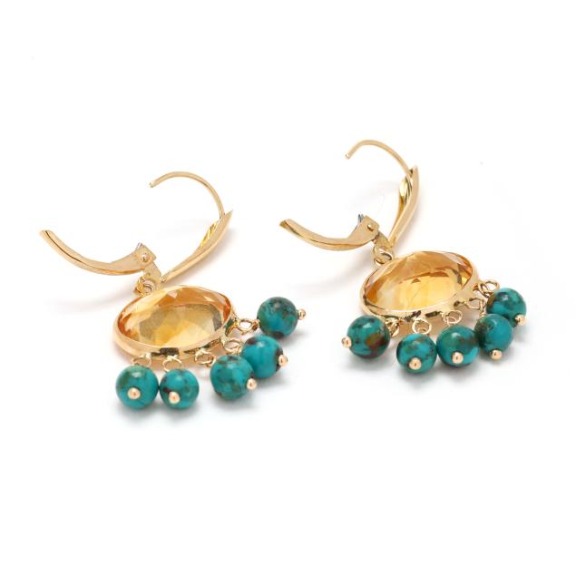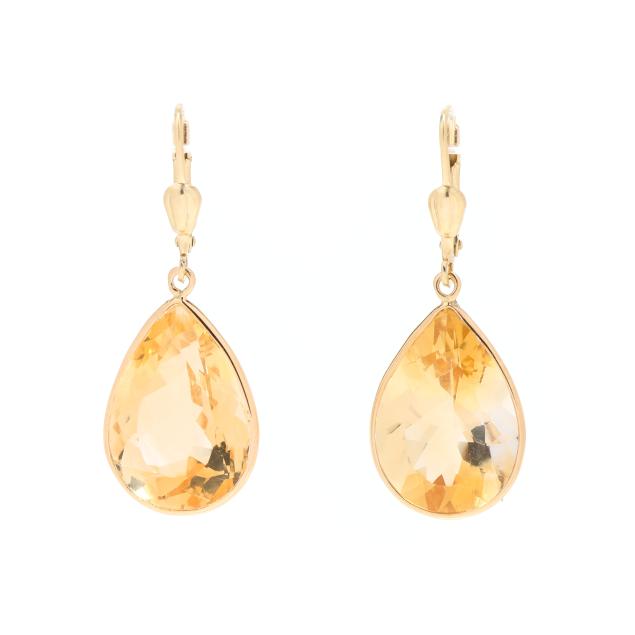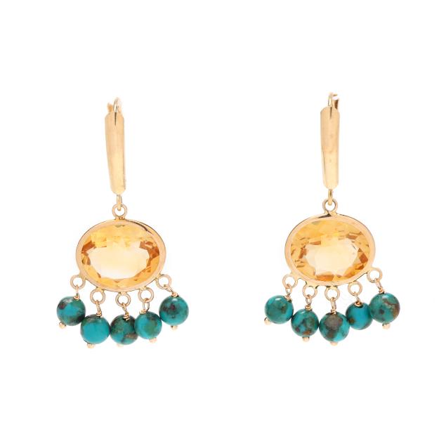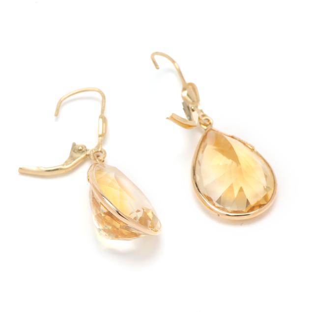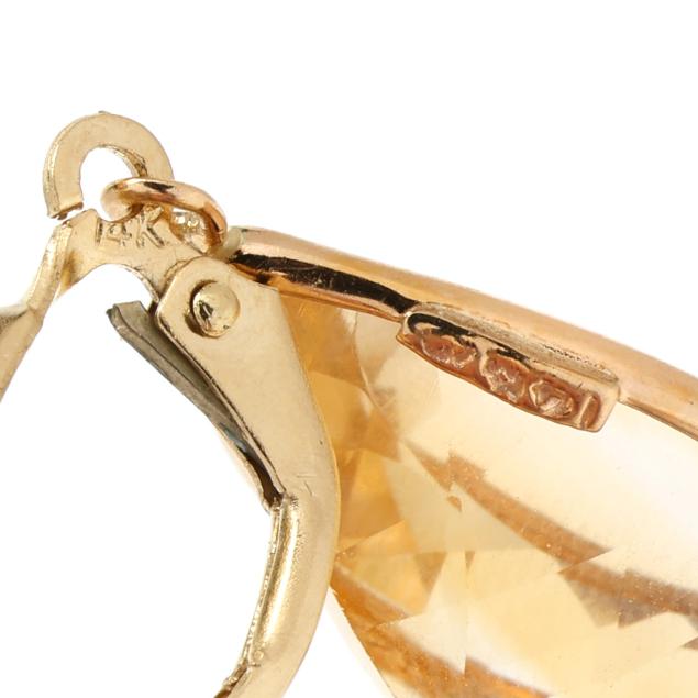 To include: a pair of gold earrings with pear cut citrine drops, with locking ear wires, stamped 14K (1 3/8 in.); and a pair of gold earrings with oval cut citrine drops suspending green beads, with locking ear wire, stamped ZB 14K (1.25 in.).