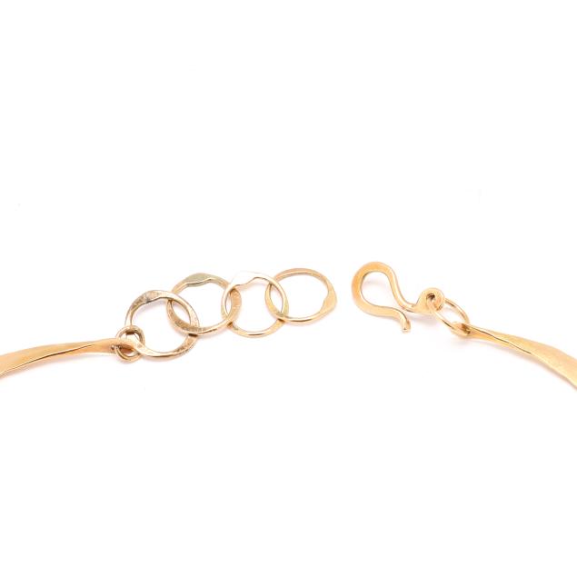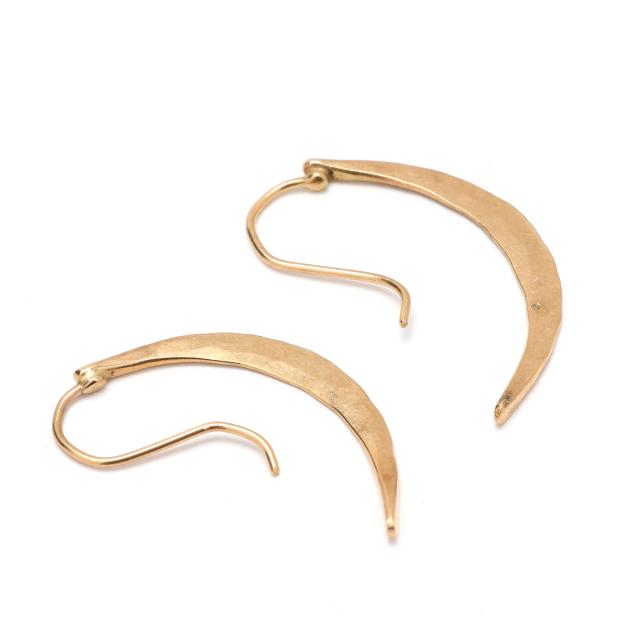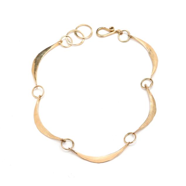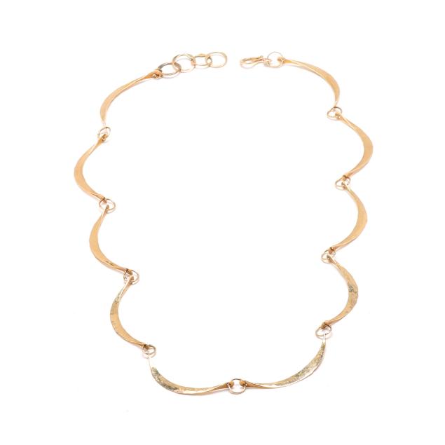 To include: a necklace comprised of crescent design links, completed with a hook and eye clasp (14.5 in.); matching bracelet (6 in.); and pair of earrings (1 in.); all XRF testing 14KT.