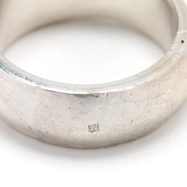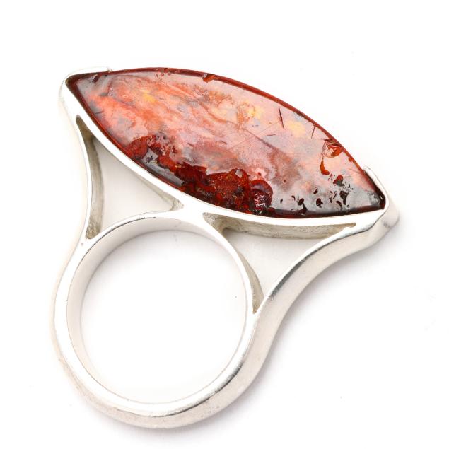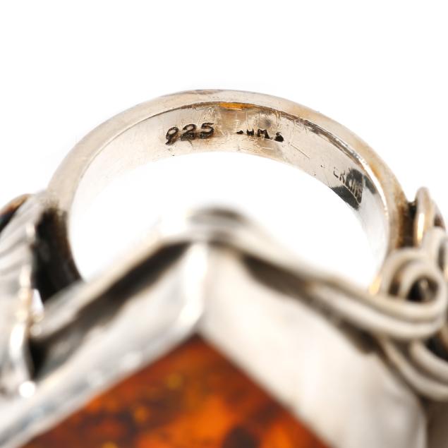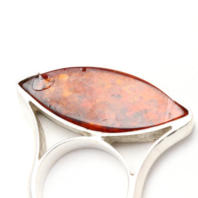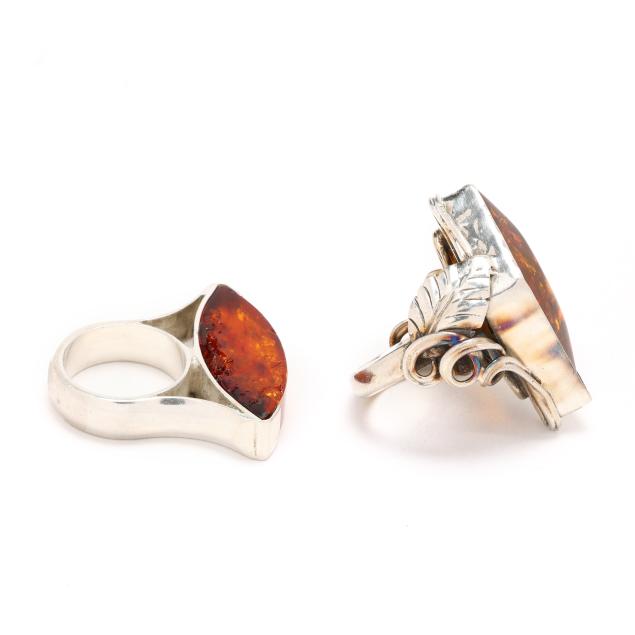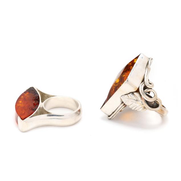 To include: a ring set with a shield cut amber with applied leaf and vine to shoulders, stamped 925 (1.5 x 1 in.; ring size 6.75); and a modernist ring with horizontally set marquise cut amber, testing silver (.25 x 1 3/8 in.; ring size 6.75) (amber with chips).