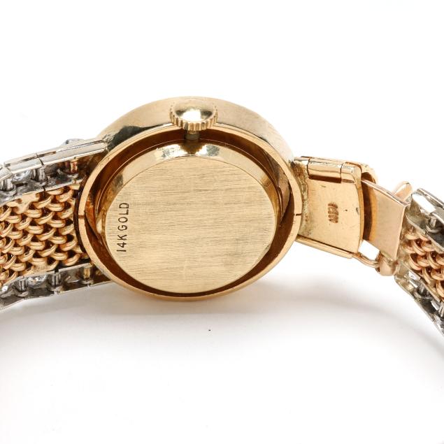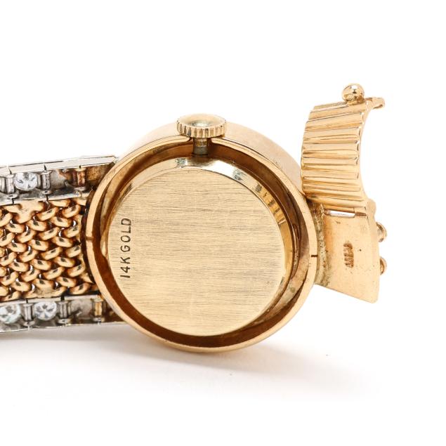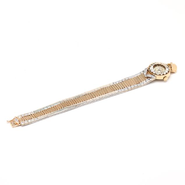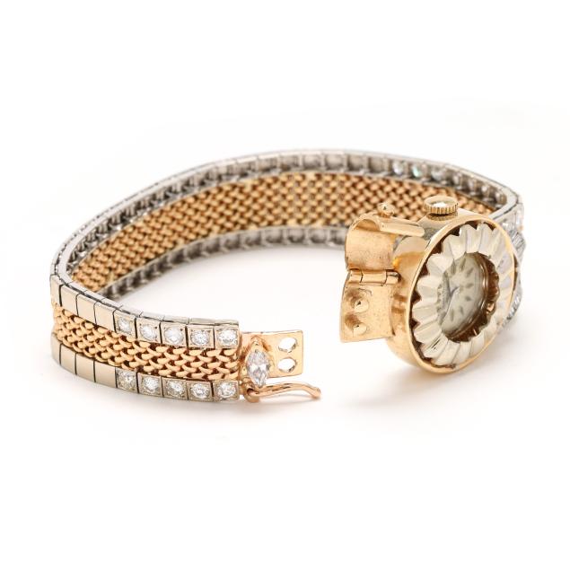 Manual wind, AS 976, the round gold case with white gold fluted bezel, the signed white dial with gold-tone Dauphine hour markers and silver-tone Dauphine hands, the gold mesh bracelet set to the edges with some white gold links set with full cut round and old European cut diamonds, and set to the ends with baguette cut and a marquise cut diamond, completed with a locking clasp with figure eight safety, the caseback stamped 14K Gold, all testing 14KT. The total diamond weight is approximately 2.75 carats (G-H color, SI1-SI2 clarity).