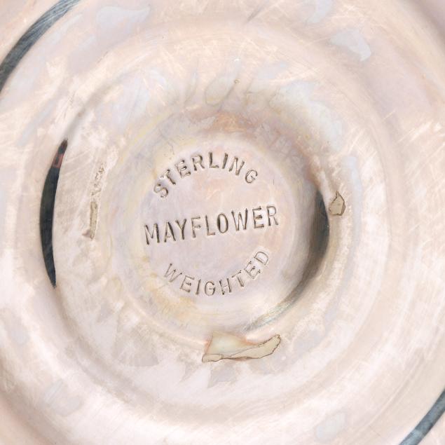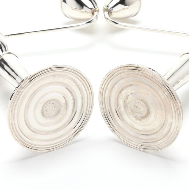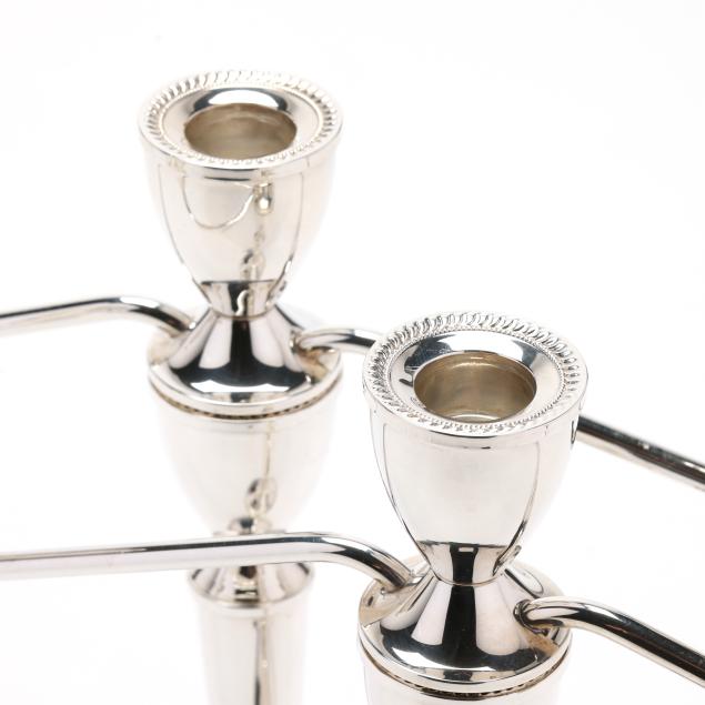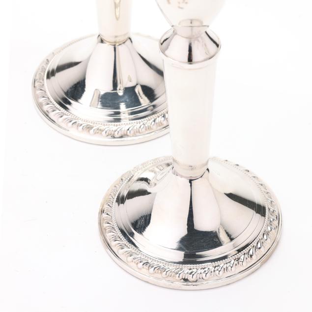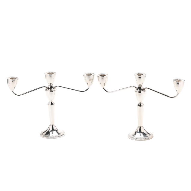 Convertible three-light forms, weighted, with gadrooning to the bobeche and base, not monogrammed.