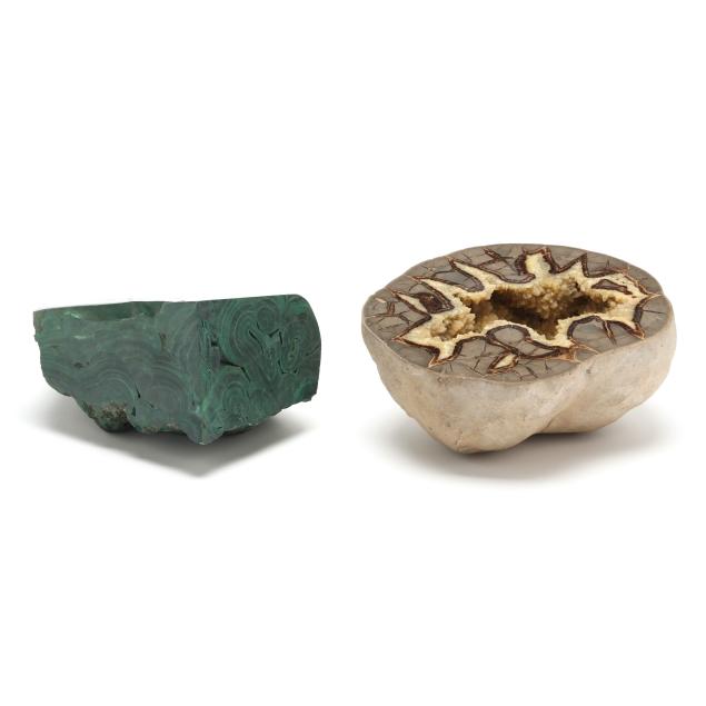 From a Private Collector, Davie County, North Carolina Malachite with some surface marks to polished side; geode with hairline to rough side, likely from process of breaking open; both with natural nicks and striations.