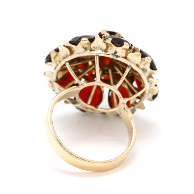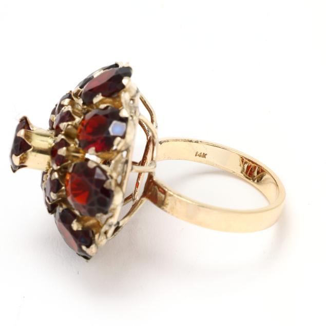 Tiered rosette set with round and oval cut garnets, stamped 14K.