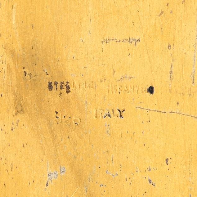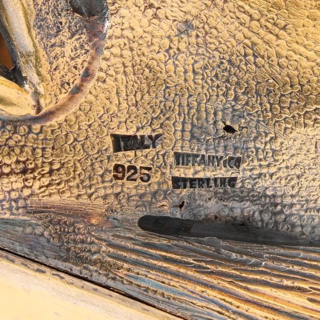 20th century, in the form of a dolphin or porpoise mounted with a shell form oblong centerpiece bowl, the surface hand-decorated with naturalistic details, marked "925 Sterling Tiffany & Co. Italy" to the underside, bowl, and base, not weighted, not monogrammed.