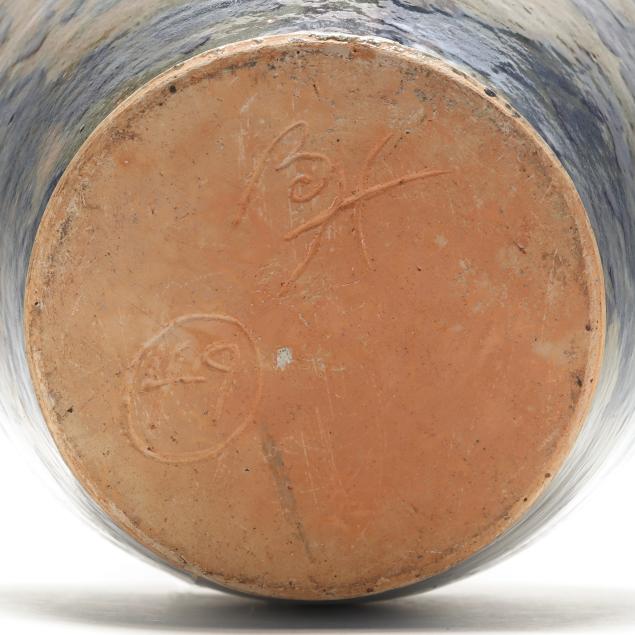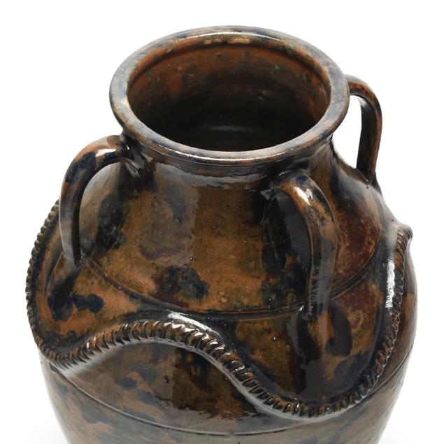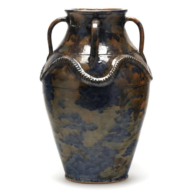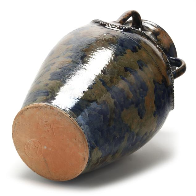 Mottled blue/olive green/and brown glazed earthenware vase with four applied handles, incised banding to shoulder, and applied rope decoration wrapping shoulder, initialed and numbered "49" to underside.