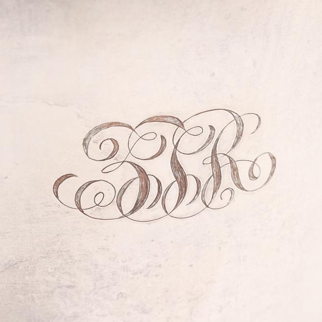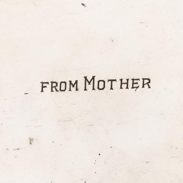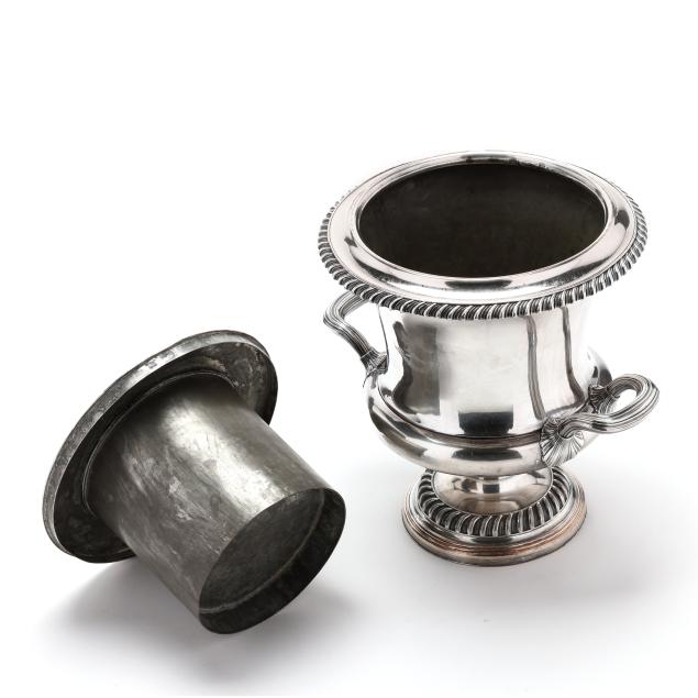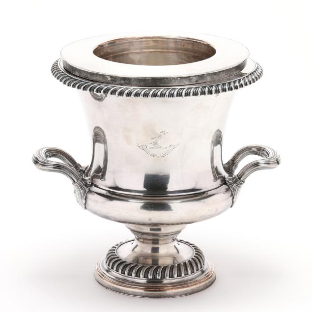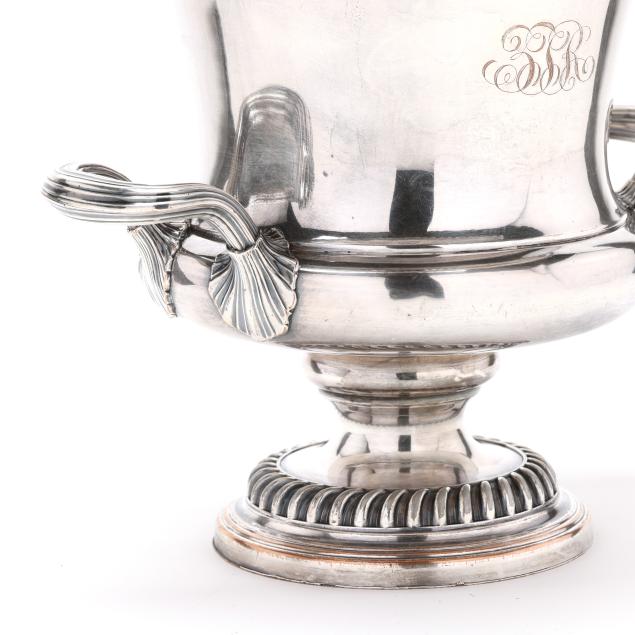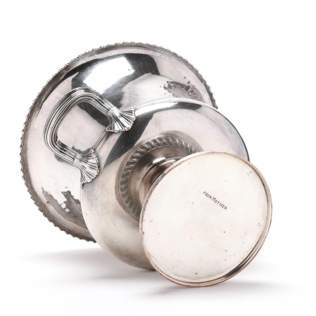 Early 20th century, classical urn form with dual branch handles, engraved "FROM MOTHER" to the underside, with script "RJR" monogram possibly for R. J. Reynolds Sr., Jr., or III; with armorial monogram reading "Hic Manus Ob Patrium"; swept gadrooned band to the upper rim and pedestal foot, with removable hat form liner.