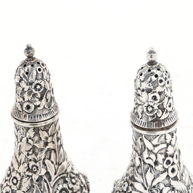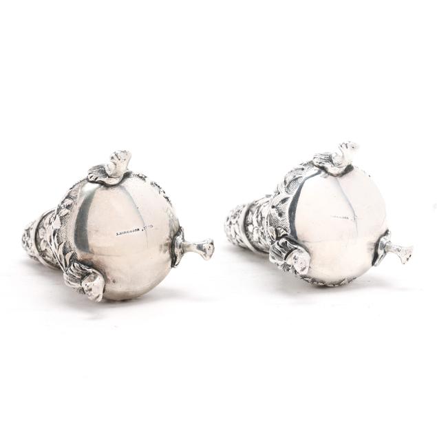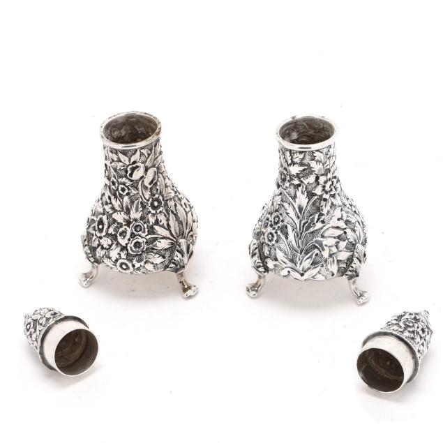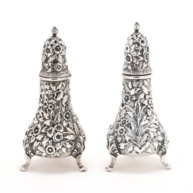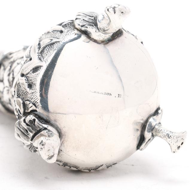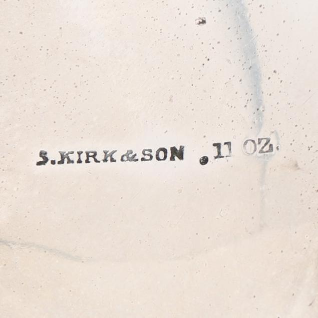 Circa 1861-1868, with "S Kirk & Son" and "11 oz" marks, featuring hand-chased repousse decoration against a stippled ground, raised on three scrolled feet, not monogrammed.