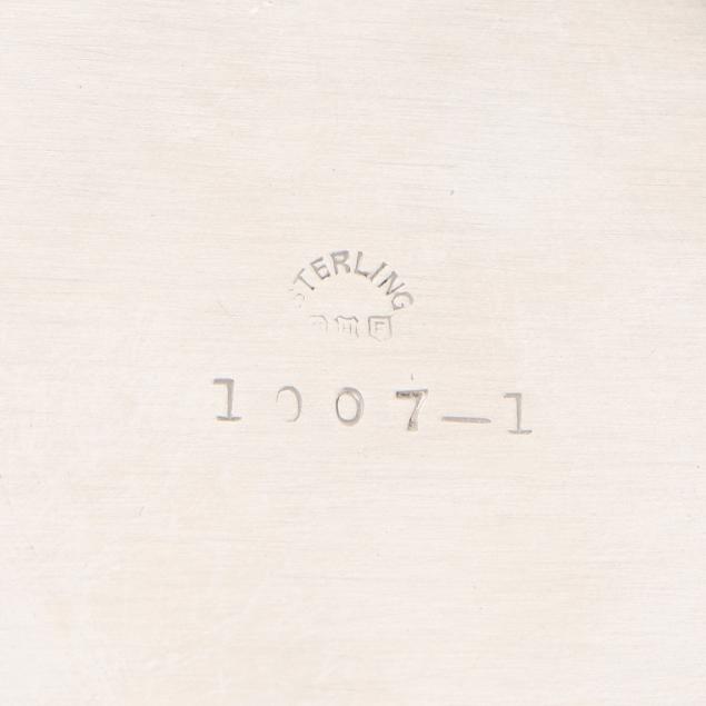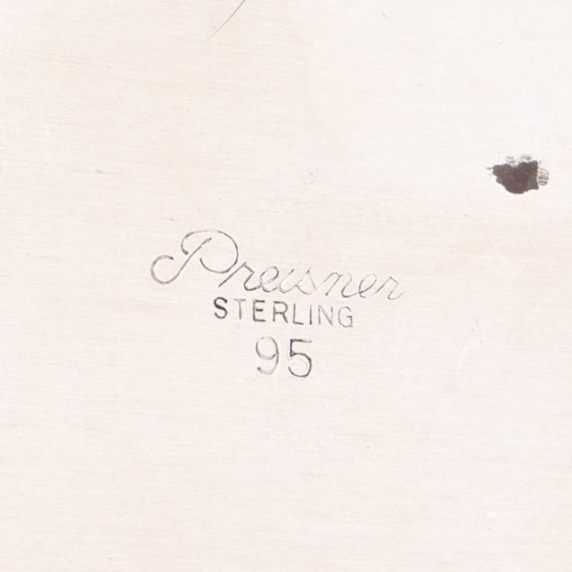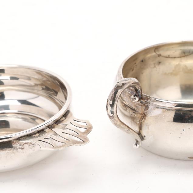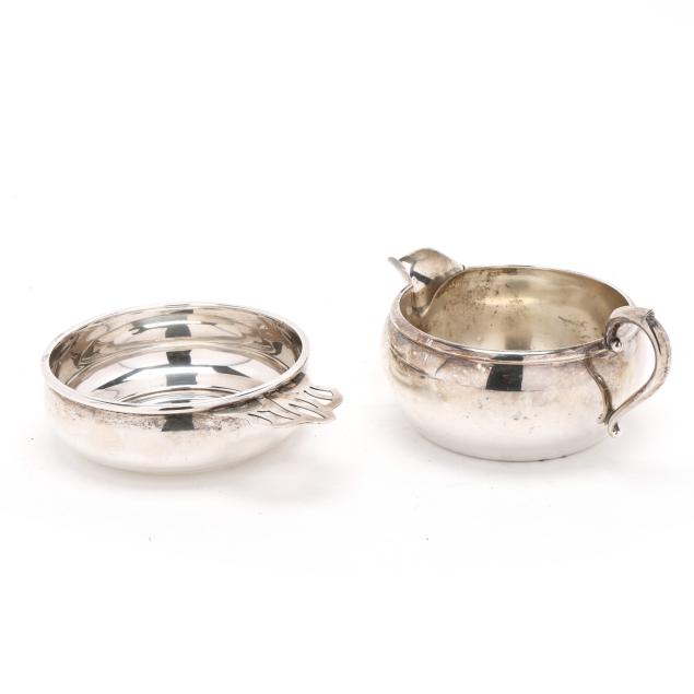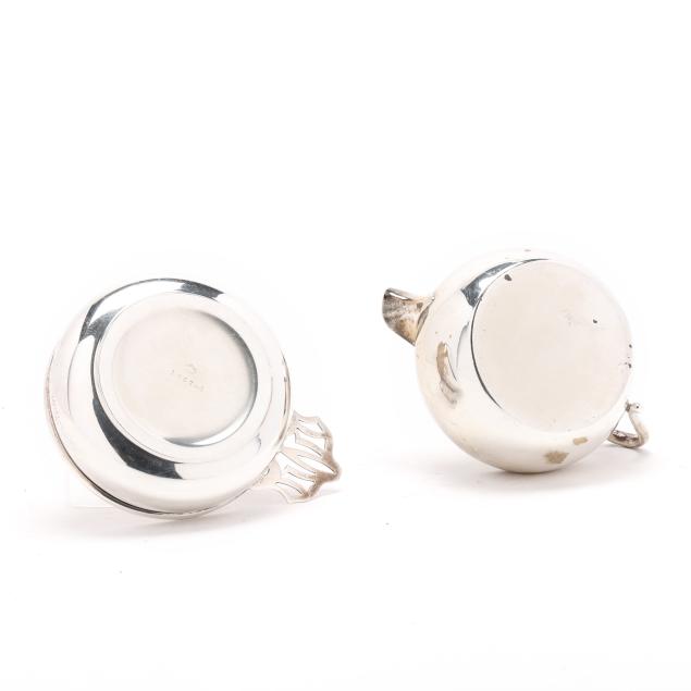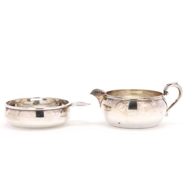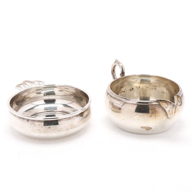 The porringer, pattern number 1007-1, with a partially rubbed manufacturer's mark and reticulated handle, engraved "Ruth Parham Watkins" (4 1/2 x 5 3/4 in.); the sauce boat, mark of Preisner, pattern number 95 (2 3/4 x 6 1/4 x 4 1/2 in.) neither monogrammed.
