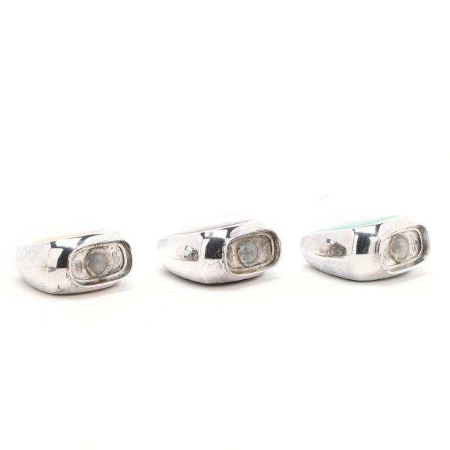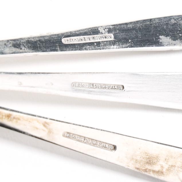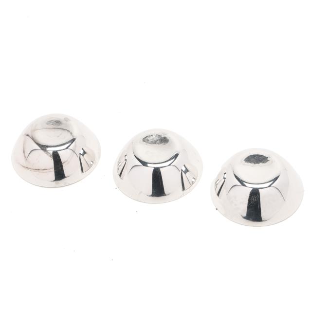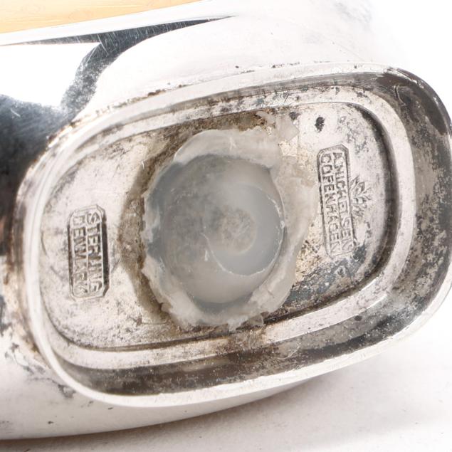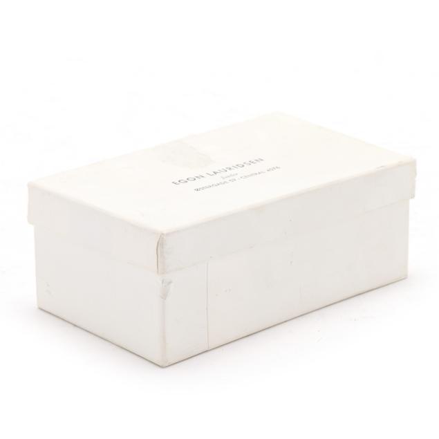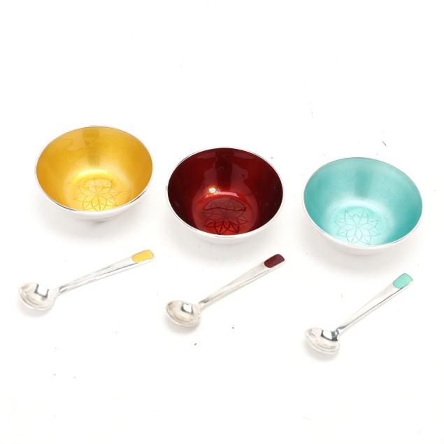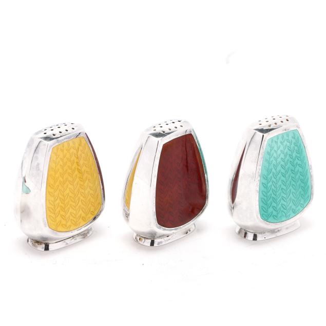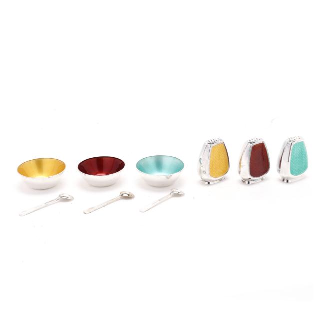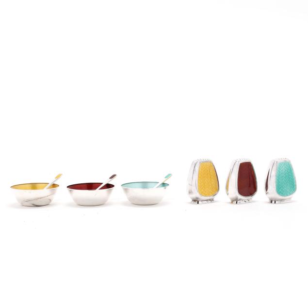 Copenhagen, mid-late 20th century, featuring a set of (3) shakers, salt cellar, and salt spoons with yellow, mint, and red enamel; retailed by Egon Lauridsen, presented with box; not monogrammed.