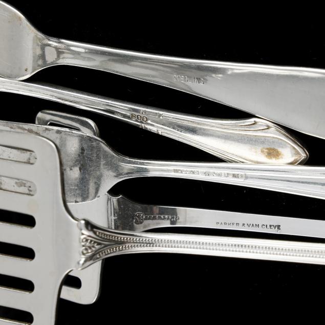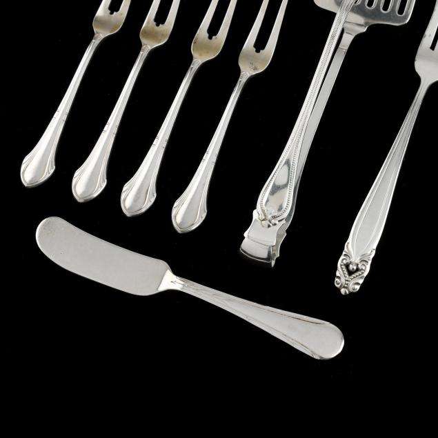 Includes (4) continental .800 silver fruit forks; a sterling butter spreader; a Wallace sterling lemon fork; and a pair Towle sterling sardine tongs, retailed by Parker & Van Cleve; not monogrammed.
