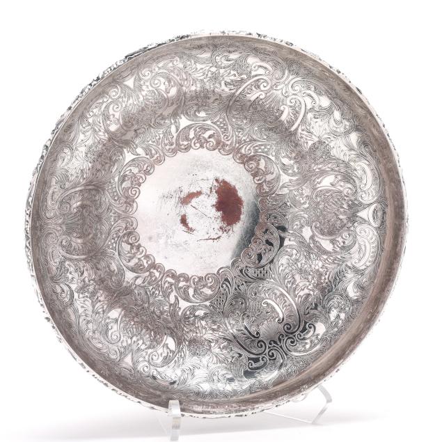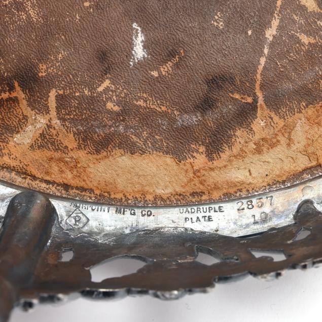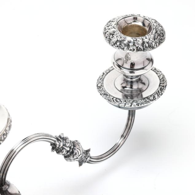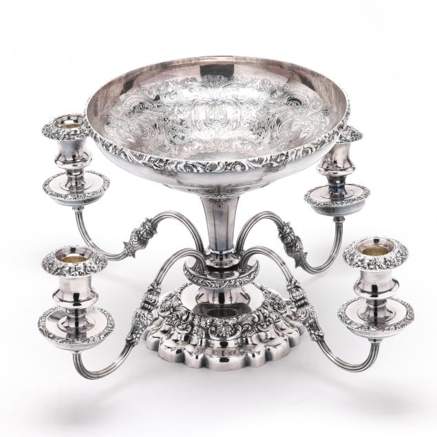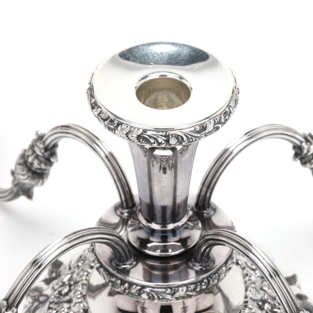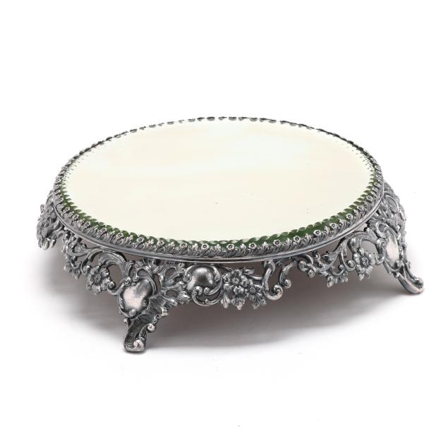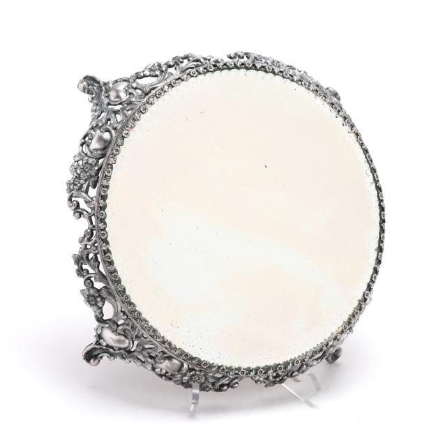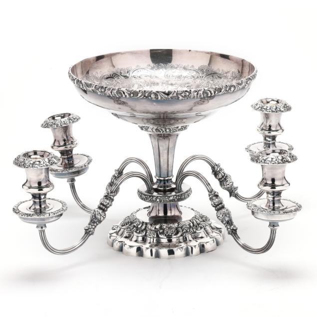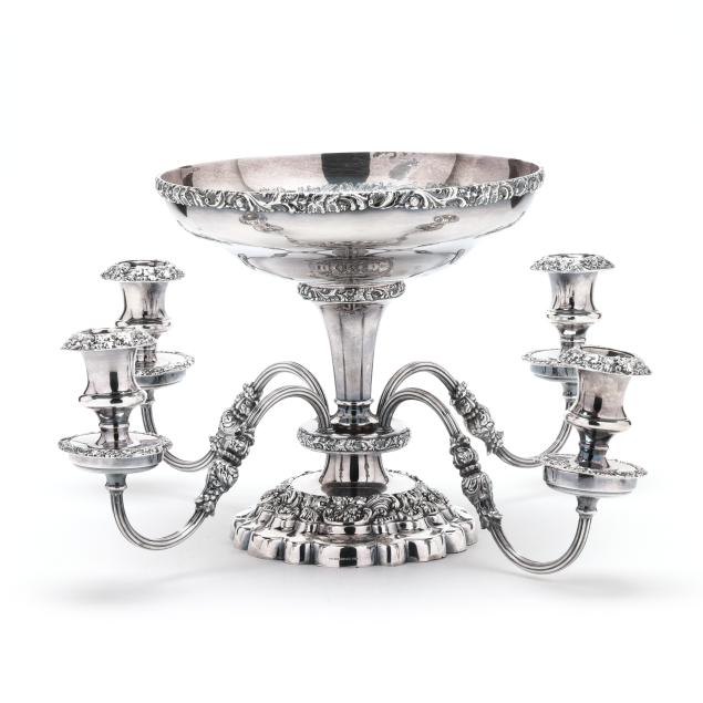 20th century, multipart convertible form, weighted, featuring four candle arms and a central bowl with rocaille decoration to the interior, relief vine decoration to the rim, bobeches, baluster, and base; presented together with a Pairpoint silver-plated mirrored plateau featuring an openwork rocaille skirt and cartouche feet, the mirror with a scallop beveled edge; not monogrammed.