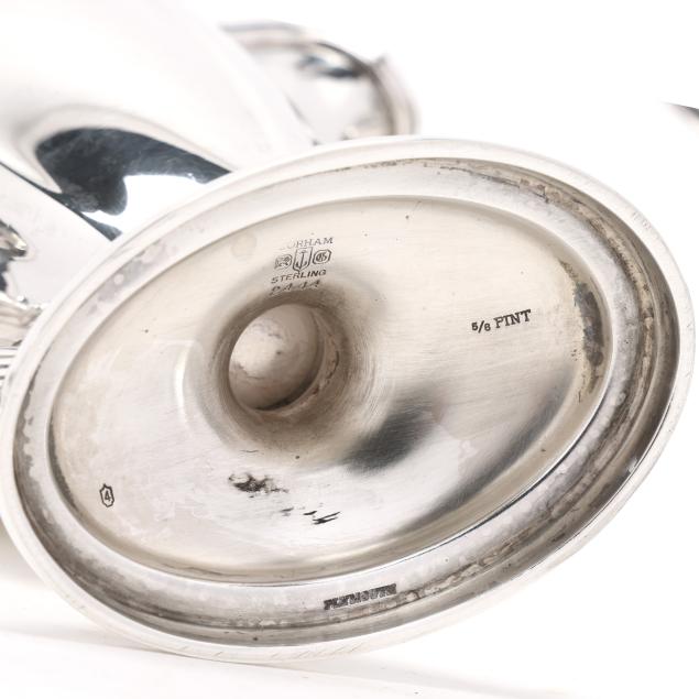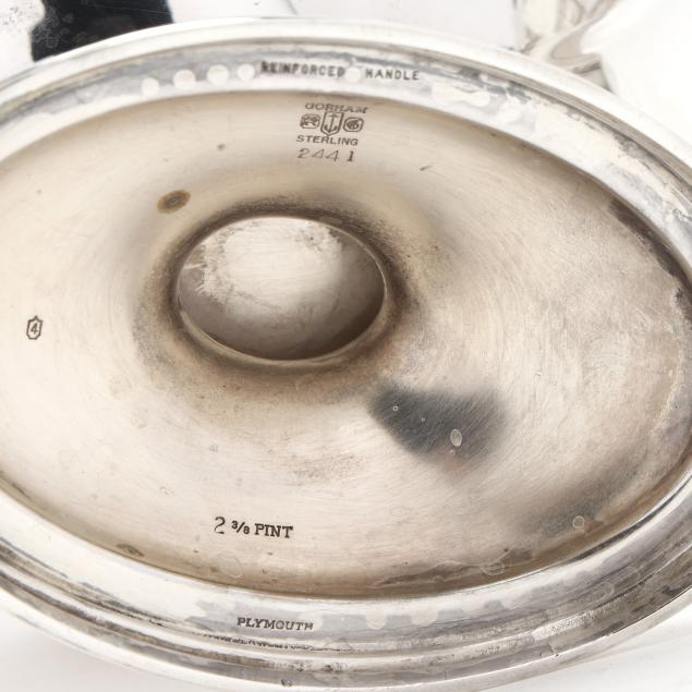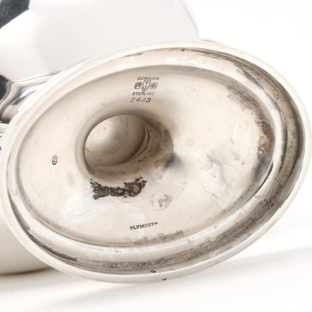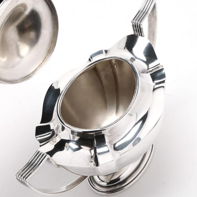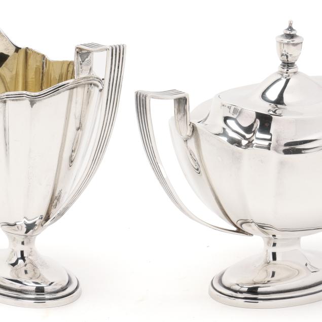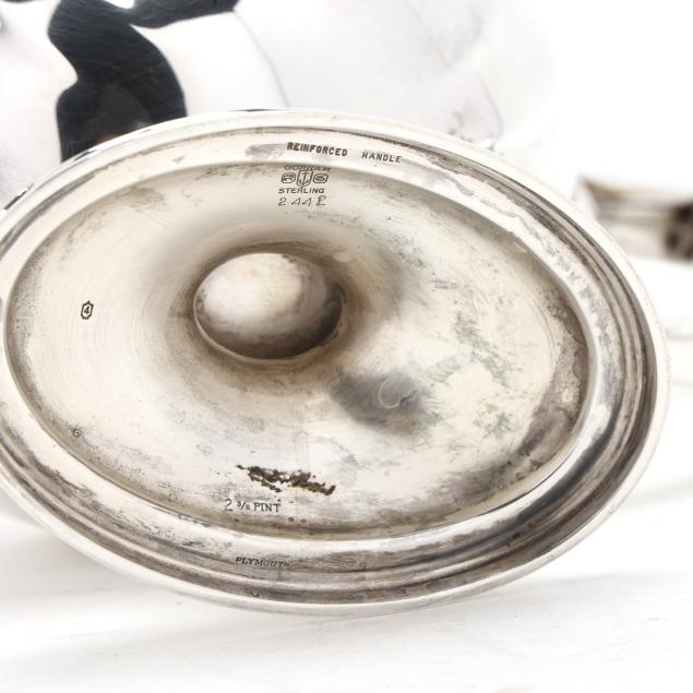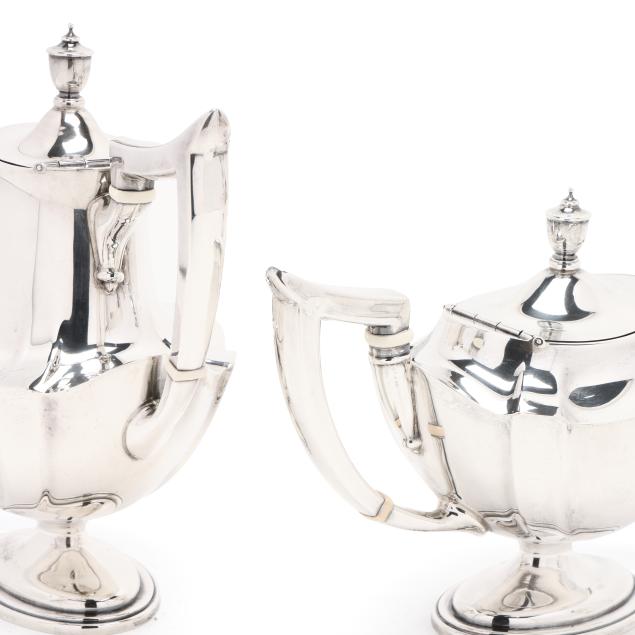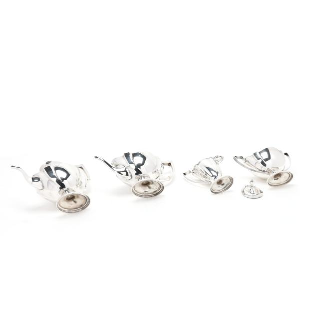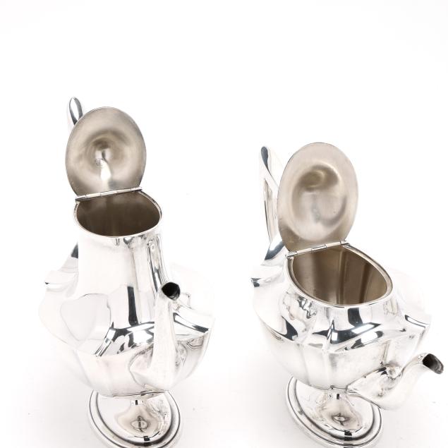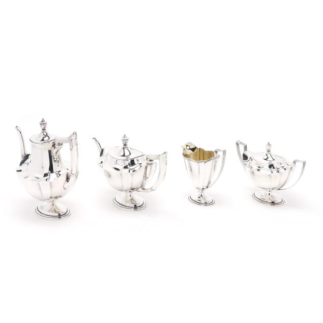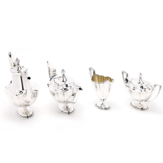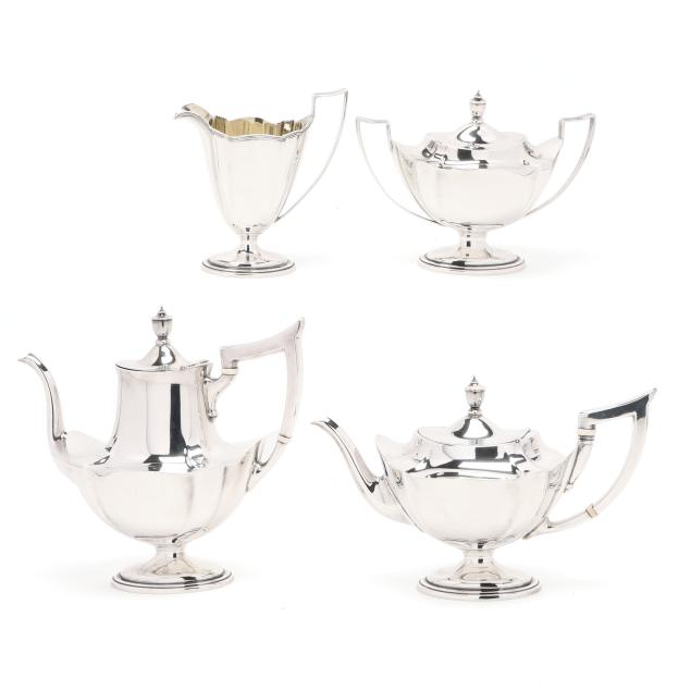 Pattern number 2442, includes a coffee pot (10 x 10 1/2 x 5 in.); teapot (7 x 12 x 5 1/2 in.); sugar bowl; and creamer, not monogrammed, retaining receipt.