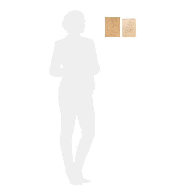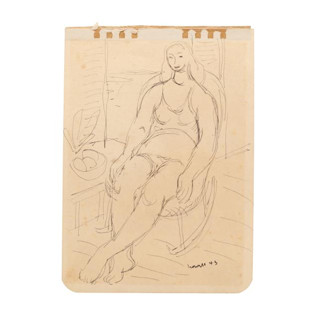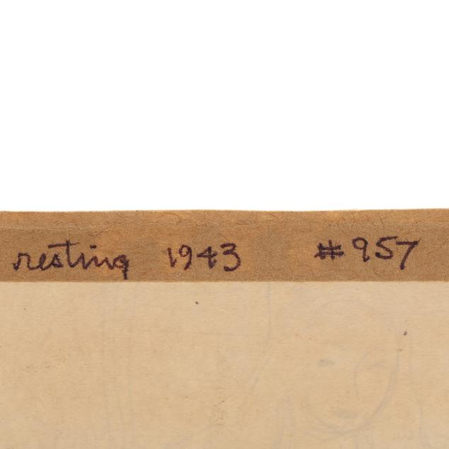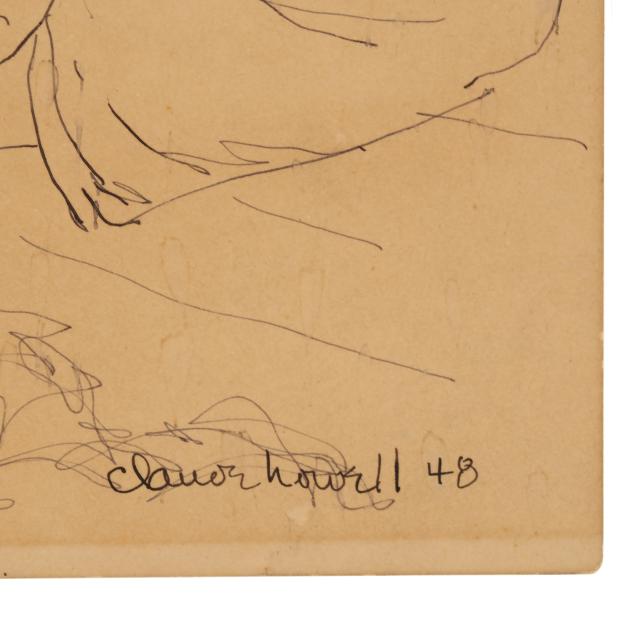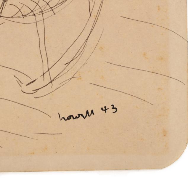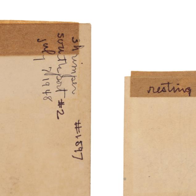 The first an ink on paper, signed and dated "Claude Howell 48" at lower right, inscribed in the artist's hand to verso "Shrimper / Southport #2 / July 7, 1948" and numbered #1597 (Sheet 7 5/8 x 5 1/2 in.); the second an ink on paper, signed and dated "Howell 43" at lower right, inscribed to strip of paper affixed to the verso "resting / 1943" and numbered #957 (Sheet 7 1/8 x 5 in.). Unframed.