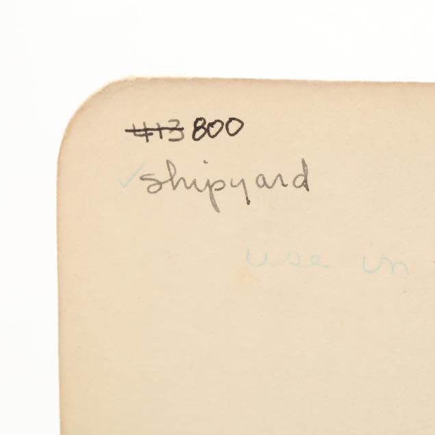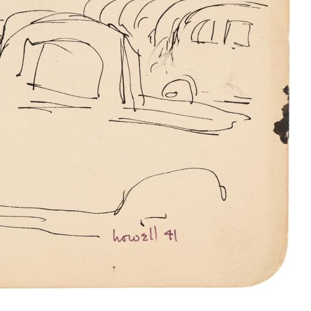 Ink on paper, signed "howell 41" at lower right, inscribed by the artist to the verso "shipyard" and numbered 800, unframed.