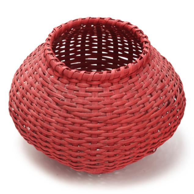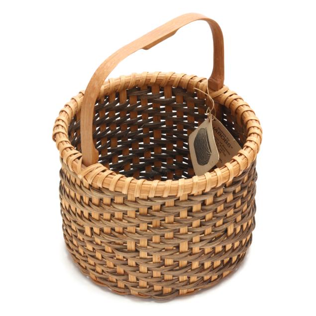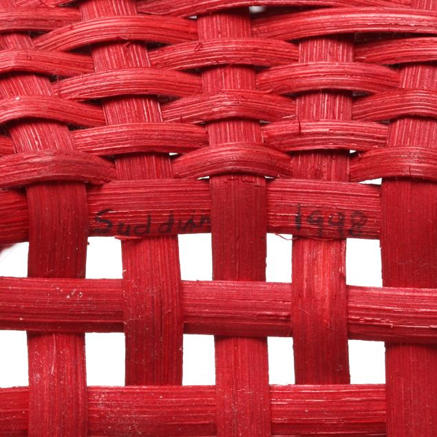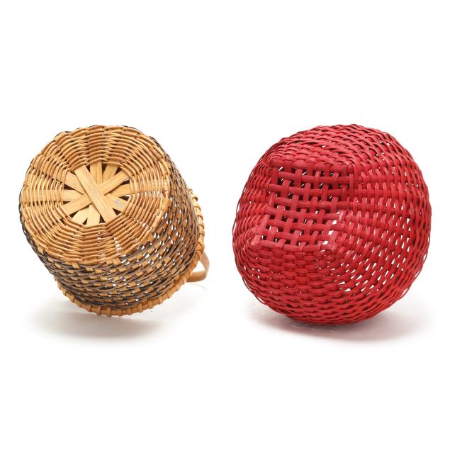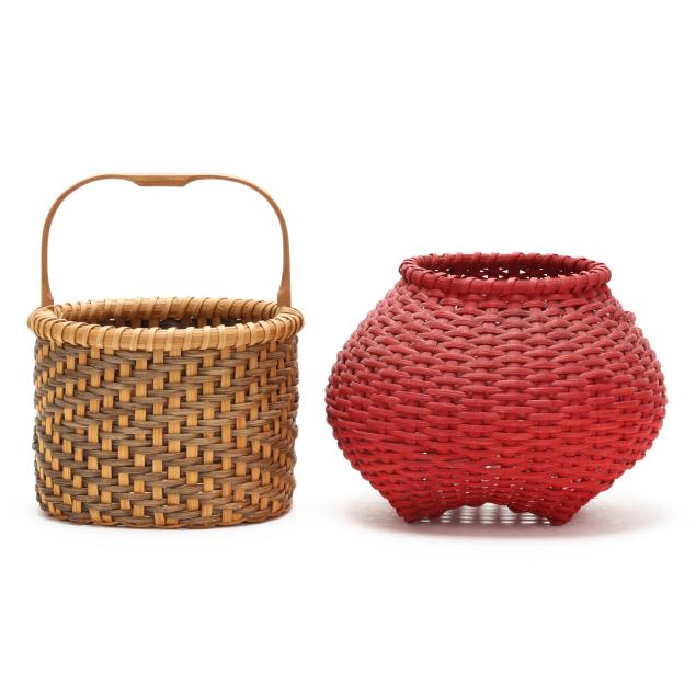 Bakersville, North Carolina, woven in oak splints with bentwood rim, the first with carved bentwood handle, featuring a umber diagonal twill work pattern, ink signed and dated "Sudduth 2007" to the underside, and retaining "'JABOBS" tag to handle (9 x 7 1/4 x 7 1/4 in.); the second in cat's head form, dyed red madder staves and weavers, featuring a subtle diagonal weave band spiraling the body, signed and dated "Sudduth 1998" to the underside (6 12 x 8 x 8 in.).