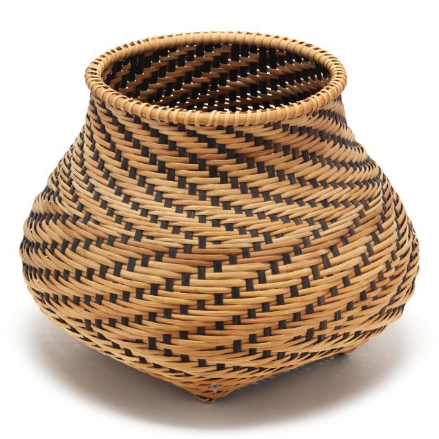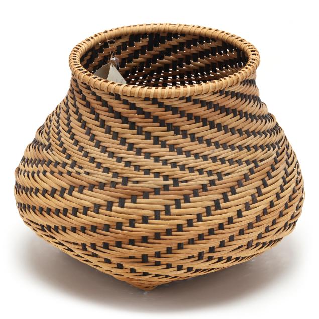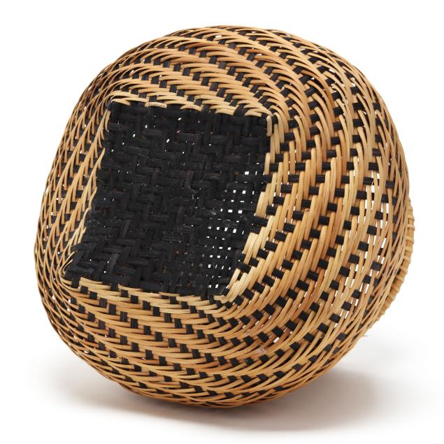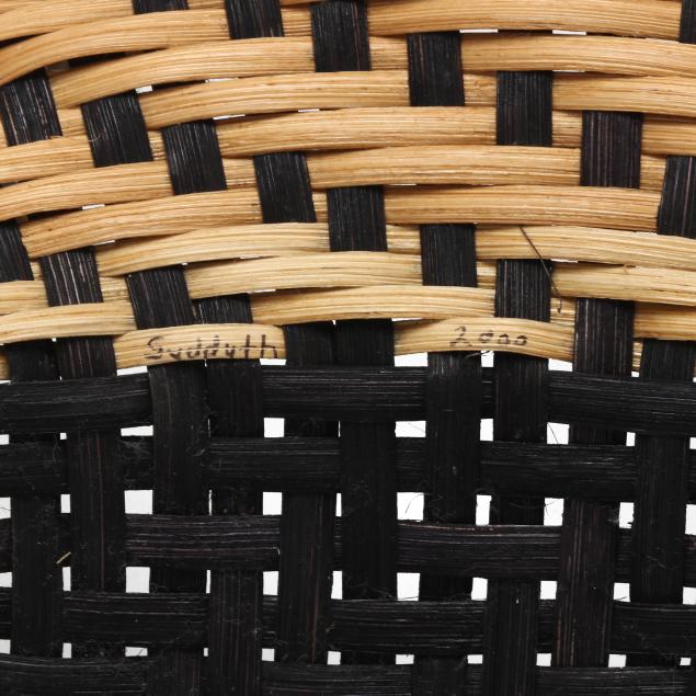 Bakersville, North Carolina, splint reed with natural dye, cat's head form with round bentwood rim, featuring dark dyed base and rising vertical staves woven in a diagonal twill pattern, ink signed and dated "Sudduth 2000" to the underside, retaining "JABOBS" tag.