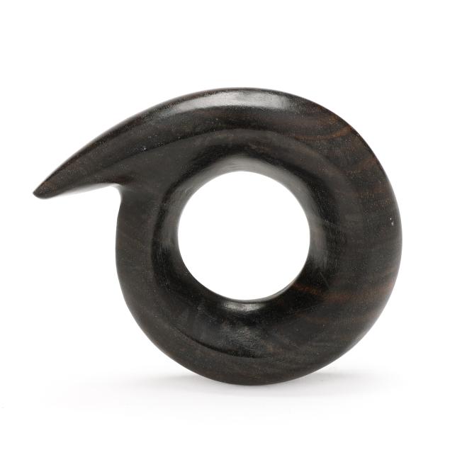 Smoothly carved wood design, completed with a single pin stem, signed.