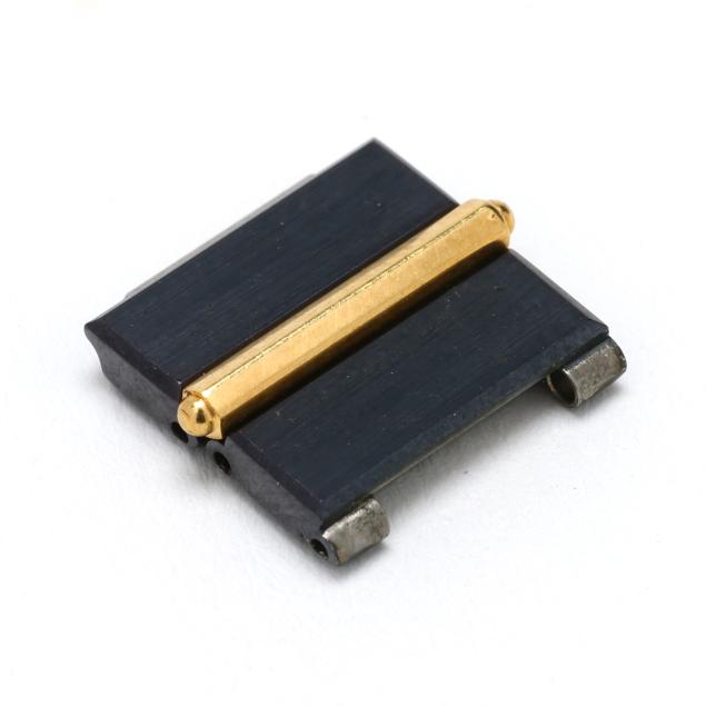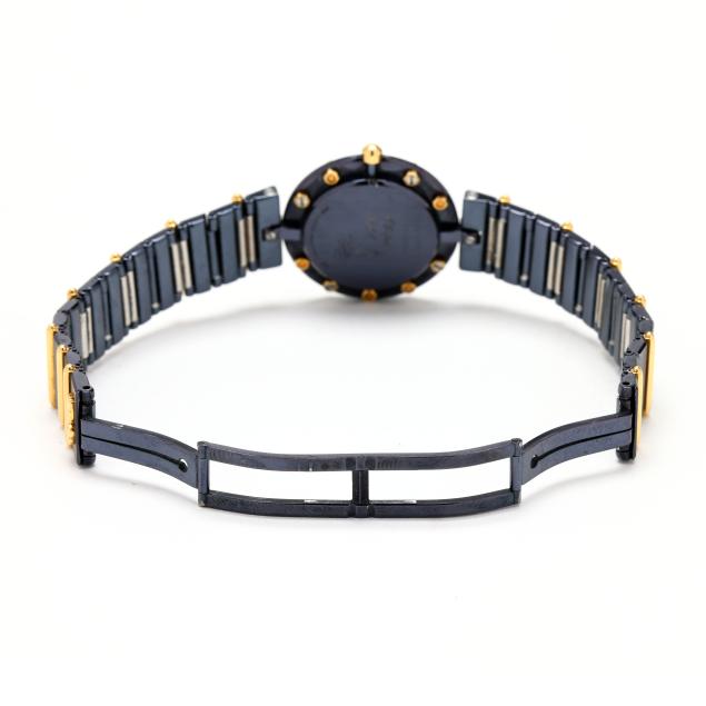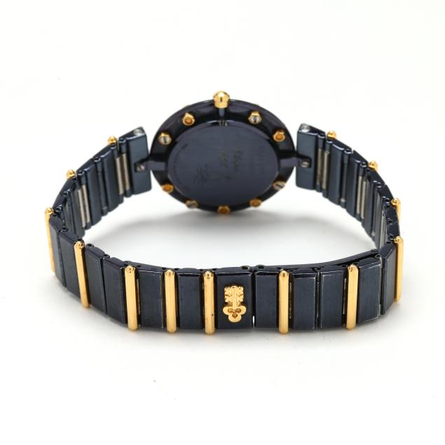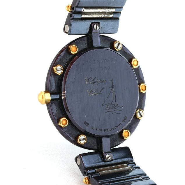 Quartz, ETA 279.001, reference number 47425.31V 36, serial number 384998, movement number 244742, the black PVD round case with gold bolts to surround, the signed black dial with gold-tone dot hour markers and gold-tone stick hands, the black PVD and gold bracelet with hidden butterfly clasp, the caseback signed, numbered, and with Clipper Club logo, gold testing 18KT.