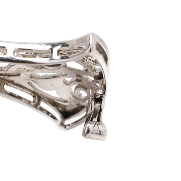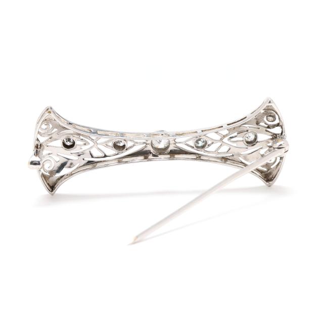 Bow design bar brooch with filigree design and milgrain detailing, set with full cut round diamonds weighing approximately .16 total carat (G-H color, SI1-SI2 clarity), completed with a single locking pin stem, stamped to lock, testing 14KT.