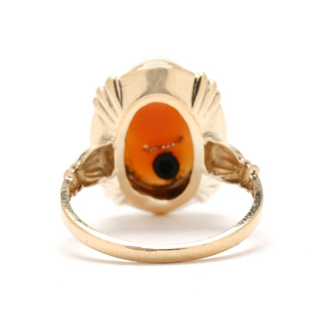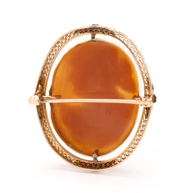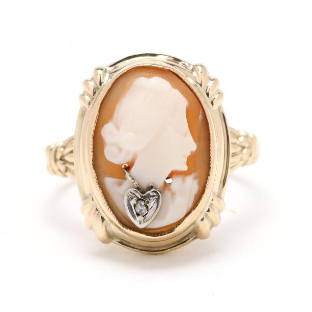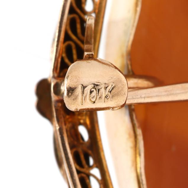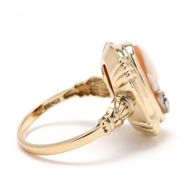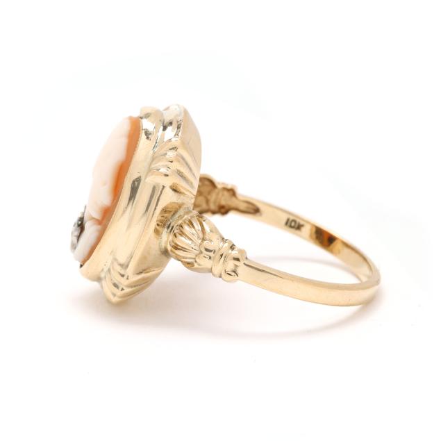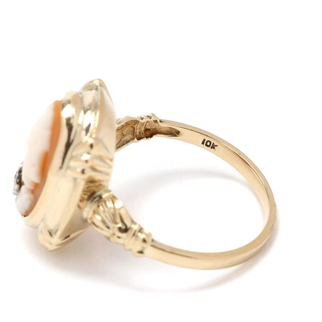 To include: a carved shell cameo of a woman set in an oval foliate decorated frame, completed with a single locking pin stem, stamped 10K (1.5 x 1.25 in.); and a ring with a carved shell cameo of a woman wearing a gem-set necklace (likely glass), the oval surround with scroll details, on a delicate shank, stamped 10K Esemco (16.5mm; ring size 6).