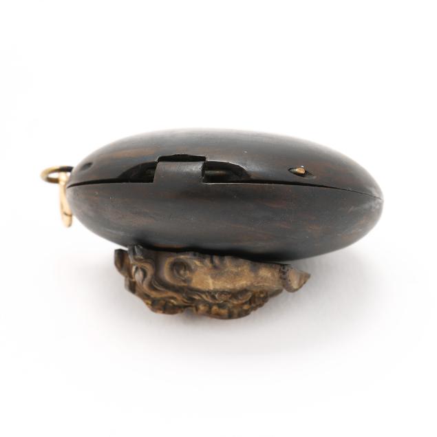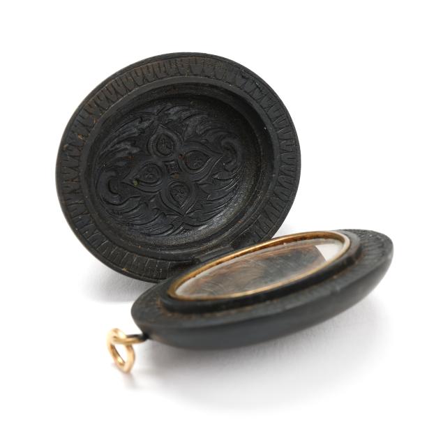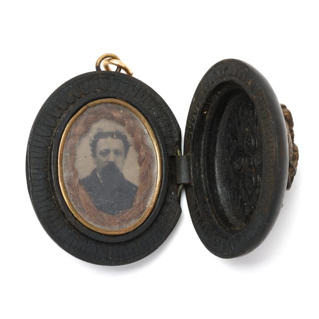 19th century, carved gutta-percha locket, the exterior front with a high relief carving of a classical figure, opens to reveal a finely carved interior with a single aperture containing a tintype of a man and a lock of hair.