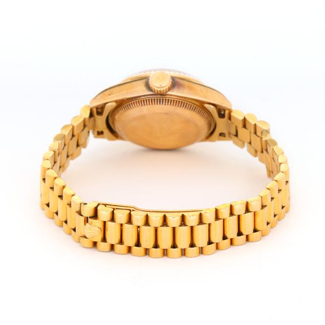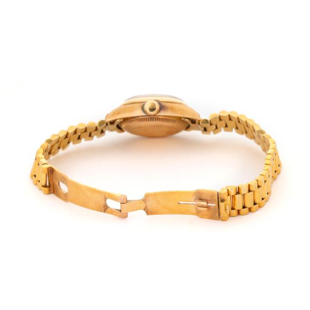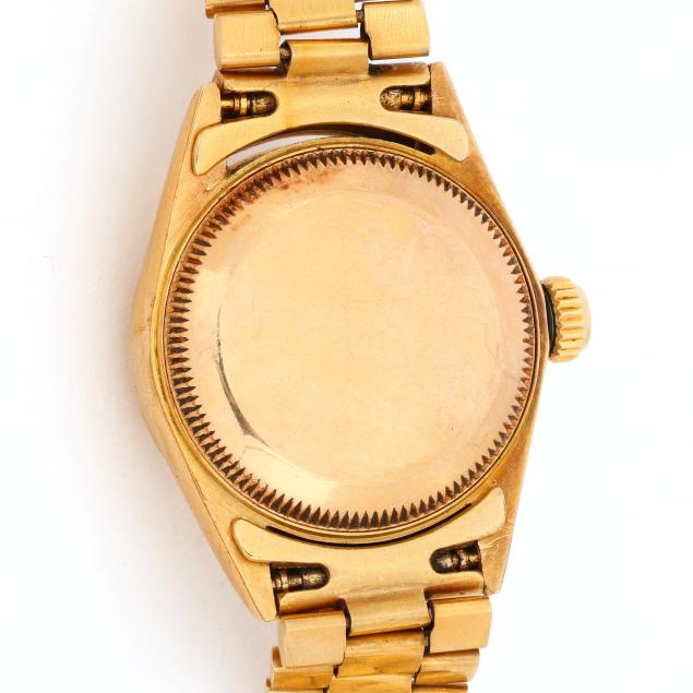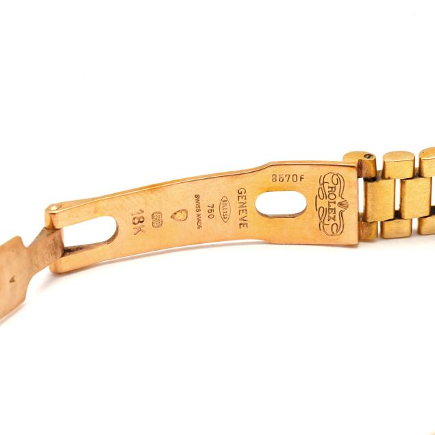 Circa 1986, automatic, reference number 69178, serial number 9016738, the gold Oyster case with fluted bezel and Swiss hallmarks for 18KT, the signed gold-tone dial with gold baton hour markers, gold baton hands, and date window at 3:00 hour, the gold President bracelet with end caps numbered 68B, completed with signed hidden deployant clasp, numbered 8570F and stamped with Swiss hallmarks for 18KT.
