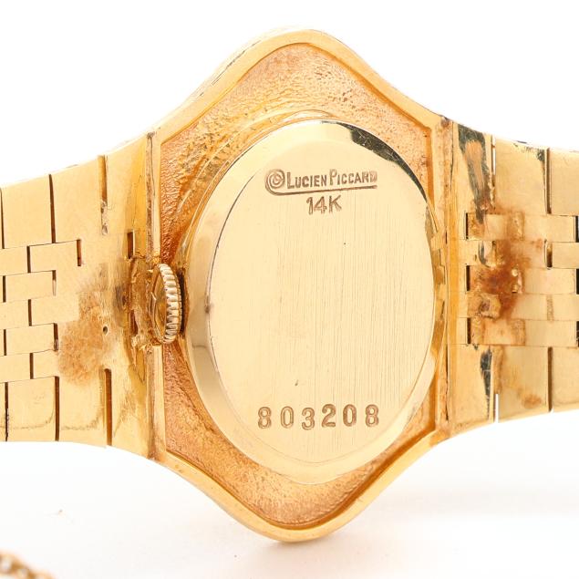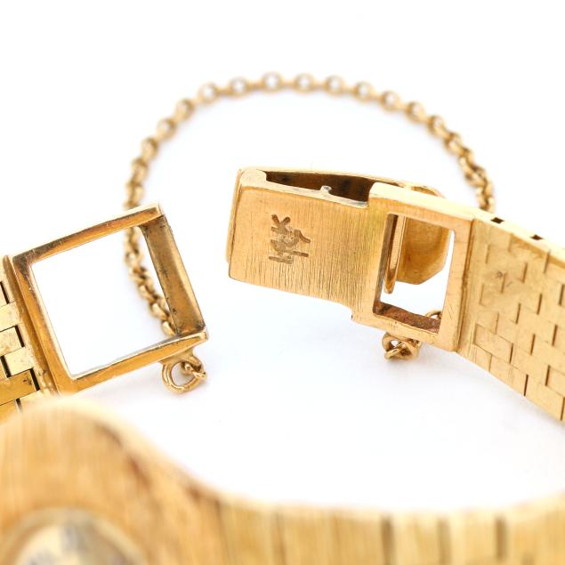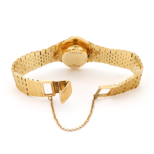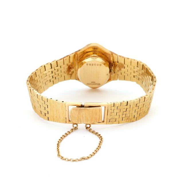 Manual wind, LP 50, serial number 803208, the oval gold case with textured bezel, the signed gilt dial with black and white enameled Roman numeral hour markers and gold-tone and black enamel Dauphine hands, the textured gold integrated bracelet completed with fold-over clasp and safety chain, clasp stamped 14K / 17, the caseback signed, numbered, and stamped 14K.