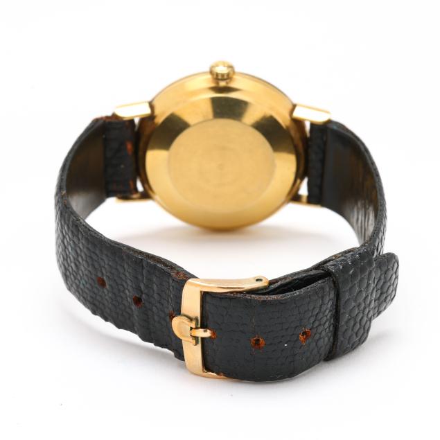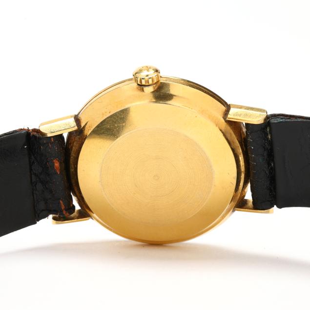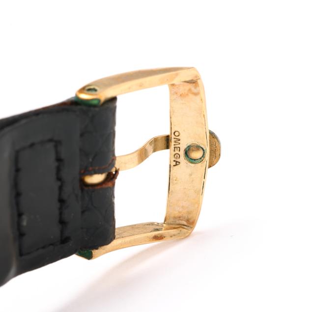 Circa 1970, automatic, the round gold-filled case with polished bezel, the signed silver-tone dial with gold-tone baton hour markers, gold-tone stick hands, and date window at 3:00 hour, the black textured leather strap with gold-tone buckle signed Omega, the caseback stamped 14K Gold Filled.