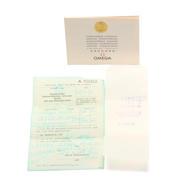 Accompanied by an Omega international guarantee and receipt dated 12 Apr 70.