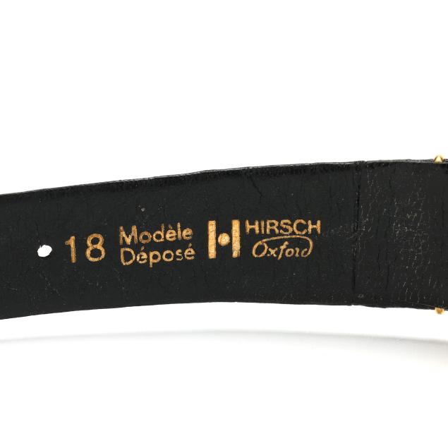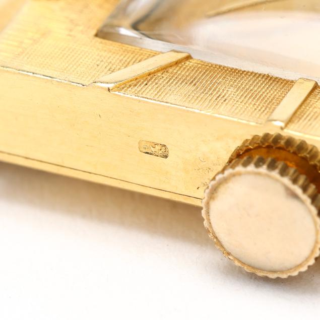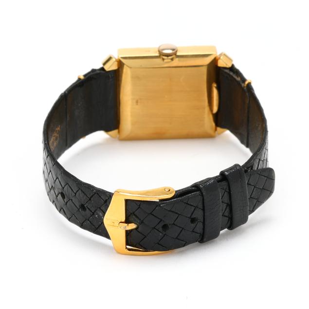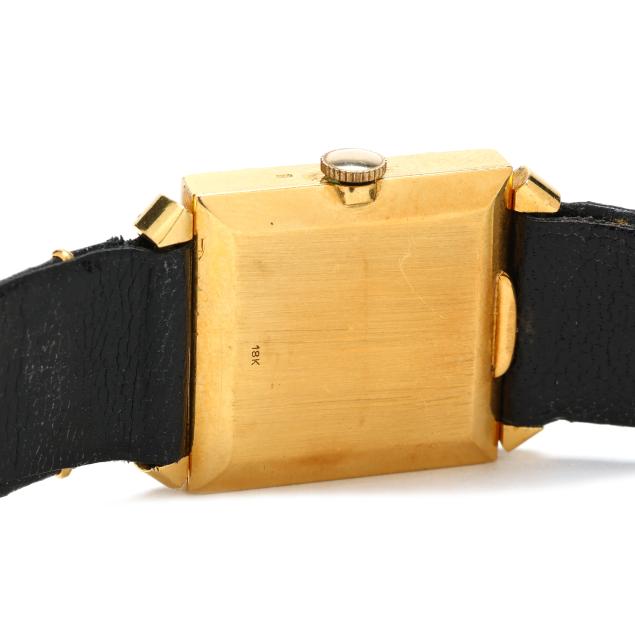 Manual wind, Movado 205, reference number 5306, serial number 207478, the square gold case with Florentine finish and raised baton hour markers to bezel, and Swiss hallmark for 18KT, the signed gilt dial with gold-tone Dauphine hands, the woven black leather strap, signed Hirsch, completed with a gold-tone buckle, the caseback stamped 18K.