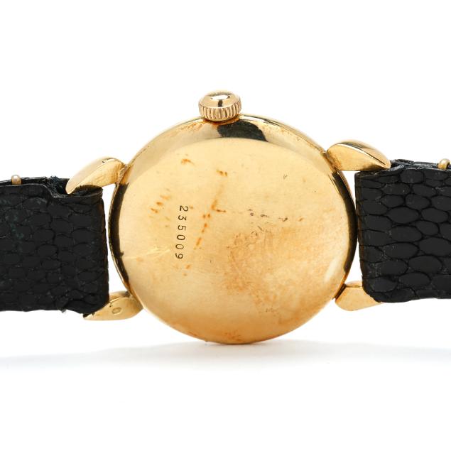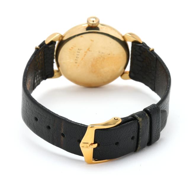 Manual wind, serial number 235009, the round gold case with polished bezel and Swiss hallmark for 14KT, the signed black dial with painted gold-tone index hour markers, gold-tone stick hands, and subsidiary second dial at 6:00 hour, the black leather strap, signed Hirsch, with gold-tone buckle, the caseback numbered and stamped 14K.
