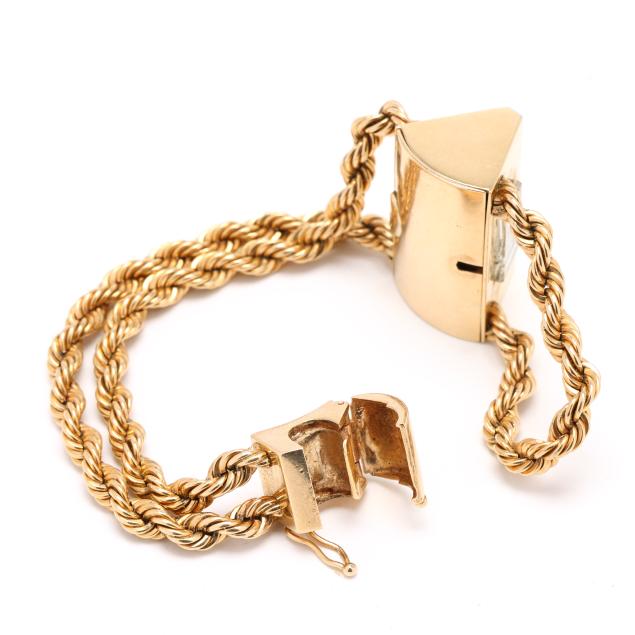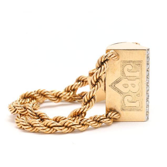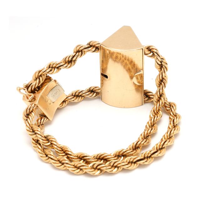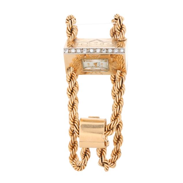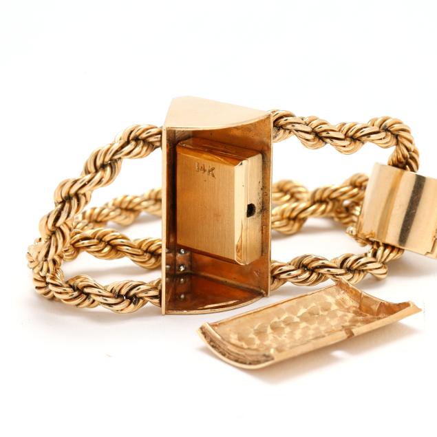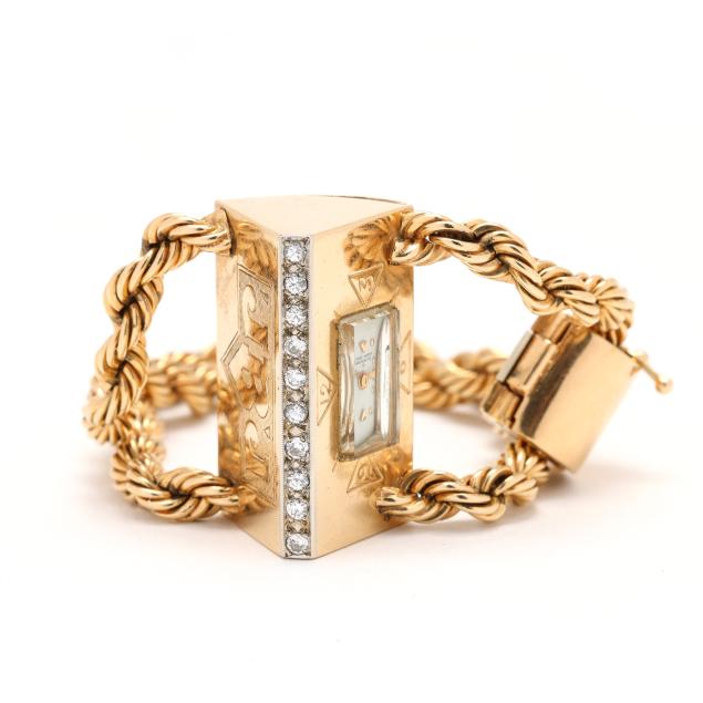 Manual wind, serial number 1502878, the wedge-shaped gold case set with full cut round diamonds weighing approximately .40 total carat (J-K color, VS2-SI1 clarity), with a polished bezel engraved 12, 3, 6, 9, and engraved with initials JBJ, the signed white dial with gold-tone dot and wedge hour markers and gold-tone dagger hands, the double rope design gold bracelet with fold-over clasp and figure eight safety stamped 14K, all testing 14KT.