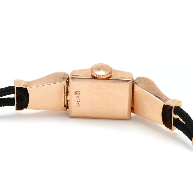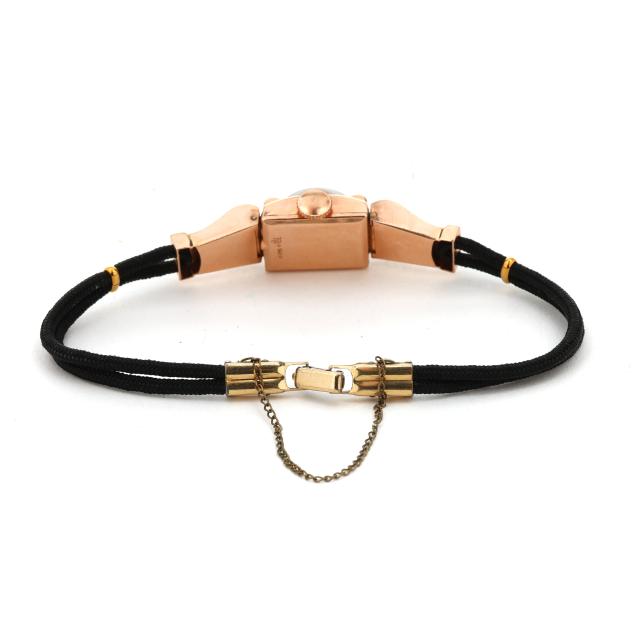 Manual wind, Gruen 290, caseback number 162508, movement number 645012, the rectangular gold case with polished bezel and single cut diamond melee lugs, the signed rose-tone dial with black Roman numeral hour markers and gold-tone stick hands, the black rope bracelet completed with gold-plated fold-over clasp and safety chain, the caseback stamped 14K.