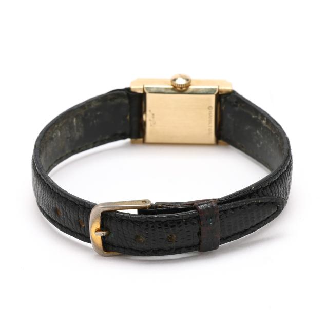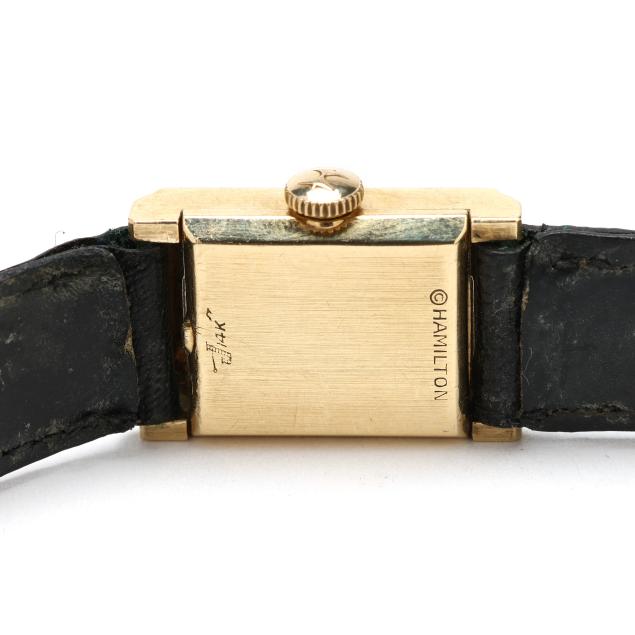Circa 1963, manual wind, Hamilton 761, serial number C15453, the rectangular gold case with brushed bezel, the signed silver-tone dial with black stick hour markers and black stick hands, the black leather strap completed with gold-tone buckle, the caseback signed and stamped 14K.