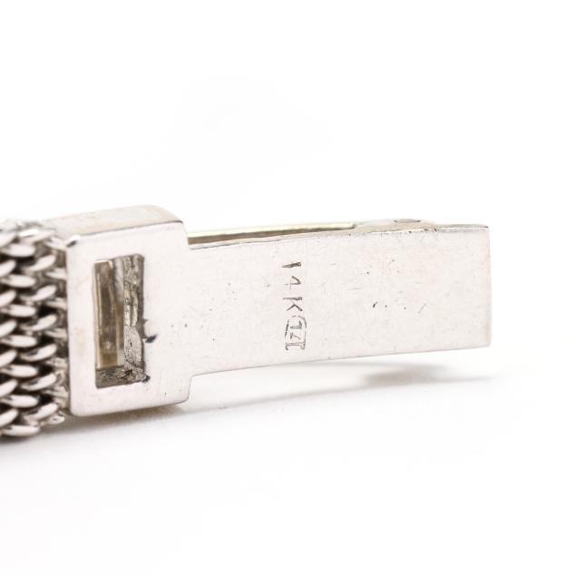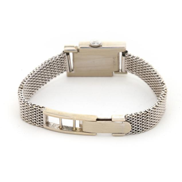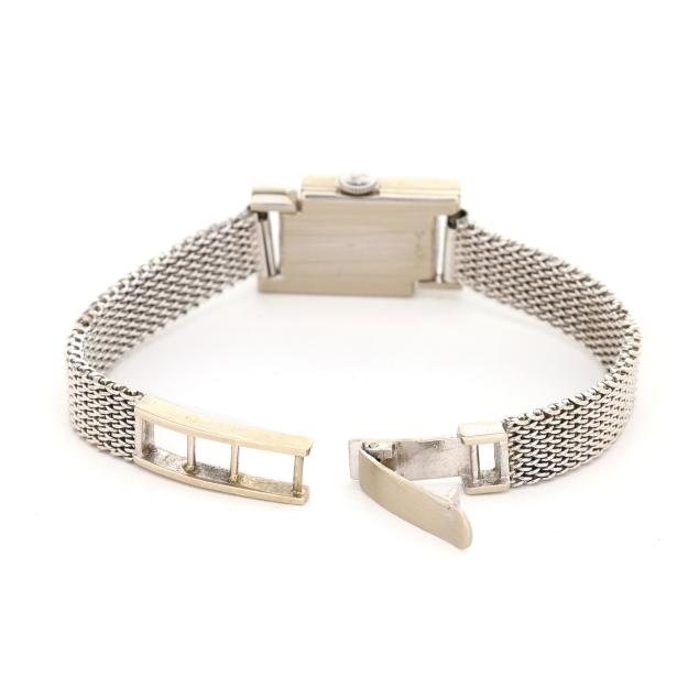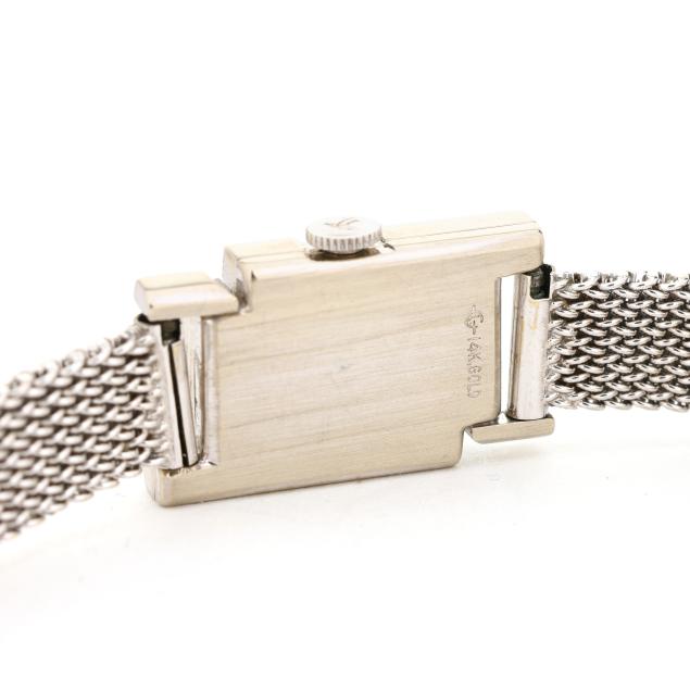 Manual wind, LeCoultre K490/BW, reference number 373-807, serial number 445816, movement number 1475468, the rectangular white gold case set with single cut diamond melee, the signed silver-tone dial with silver-tone dot hour markers and sword hands, the white gold mesh bracelet completed with a fold-over clasp stamped 14K, the caseback stamped 14K Gold.