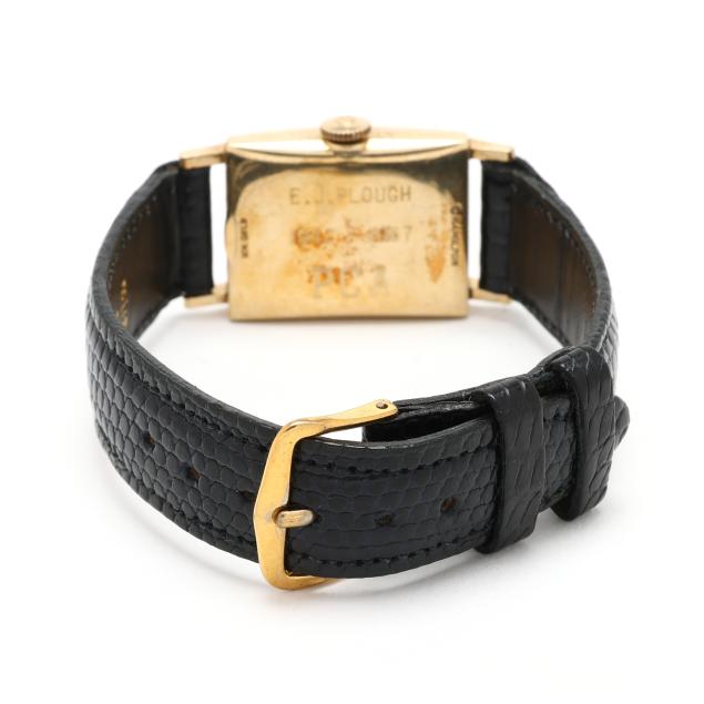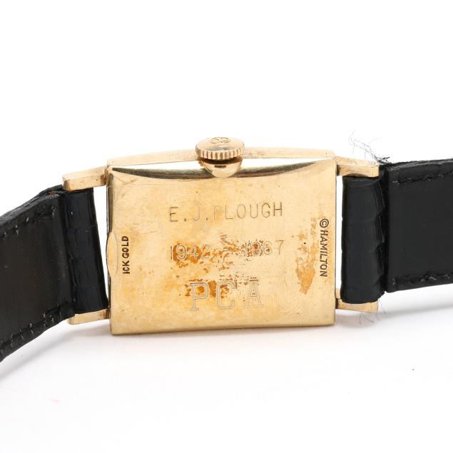 Circa 1967, manual wind, Hamilton 770, caseback number V15624, the rectangular gold case with polished bezel, the signed silver-tone dial with gold-tone Arabic numeral hour markers, gold-tone stick hands, and subsidiary second dial at 6:00 hour, the black lizard strap completed with gold-tone buckle, the caseback signed, with presentation engraving "E.J. Plough / 1942-1967 / PCA" and stamped 10K Gold.