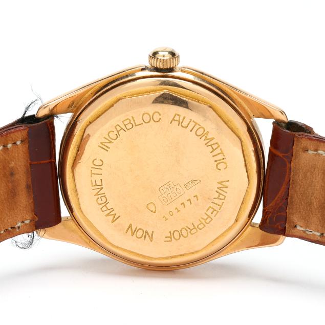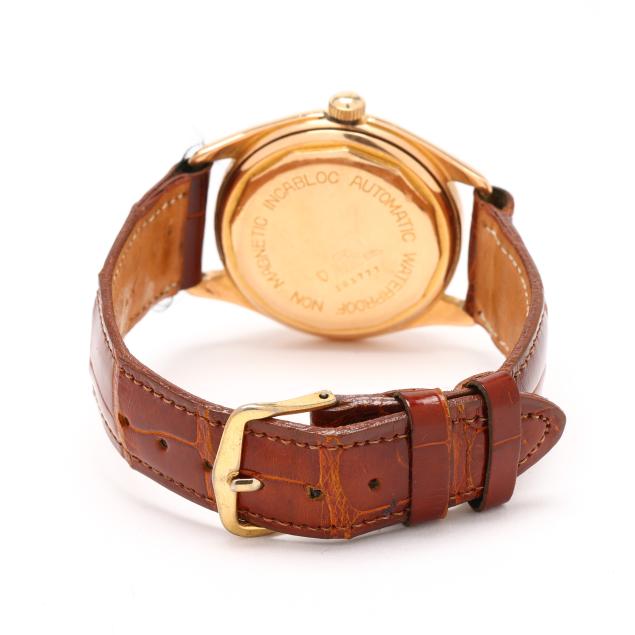Automatic, Omega 1020, case number 101777, serial number 38218087, the round gold case with polished bezel, the signed silver-tone dial with gold-tone baton hour markers, gold-tone baton hands, and day/date window at 3:00 hour, the brown crocodile strap completed with gold-tone buckle, the caseback numbered and with Swiss hallmarks for 18KT, XRF testing 18KT.