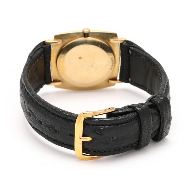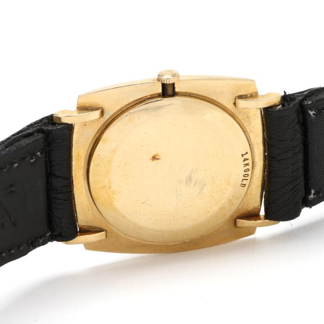 Circa 1965, manual wind, Omega 620, reference number D6660, serial number 612336, movement number 21138831, the cushion-shaped gold case with Florentine finish, the signed silver-tone dial with gold-tone baton hour markers and gold-tone stick hands, the black leather strap completed with a gold-tone buckle, the caseback marked 14K Gold.