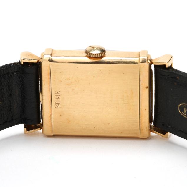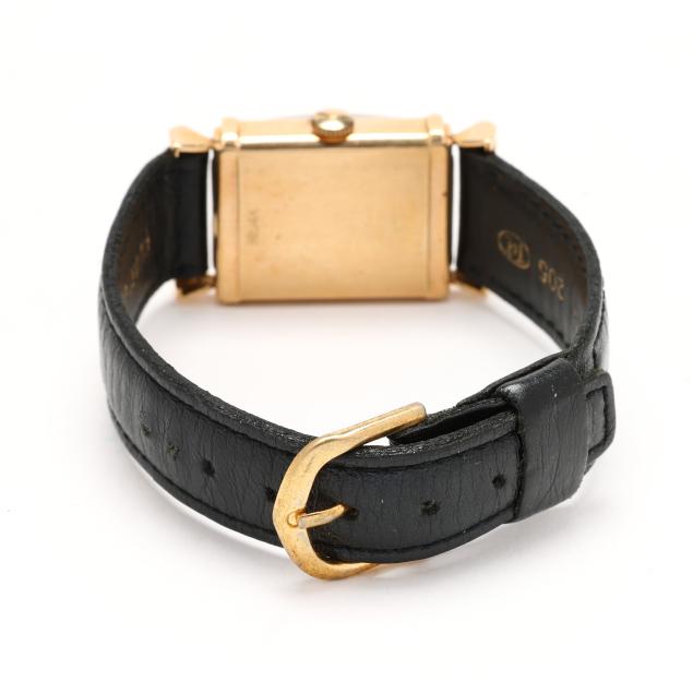 Manual wind, Longines 9L, caseback number 821277, movement number 7620218, the rectangular gold case with polished bezel, the signed silver-tone dial with silver-tone Arabic numeral hour markers, gold-tone leaf hands, and subsidiary second dial at 6:00 hour, the black leather strap completed with a gold-tone buckle, the caseback stamped 14K.
