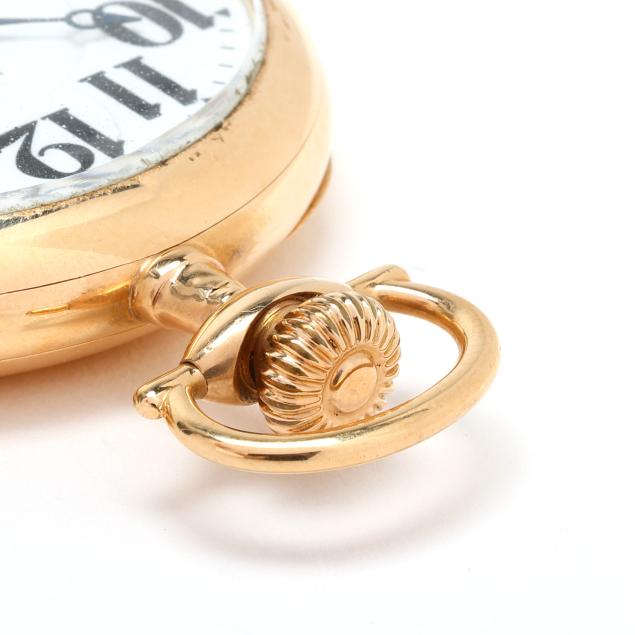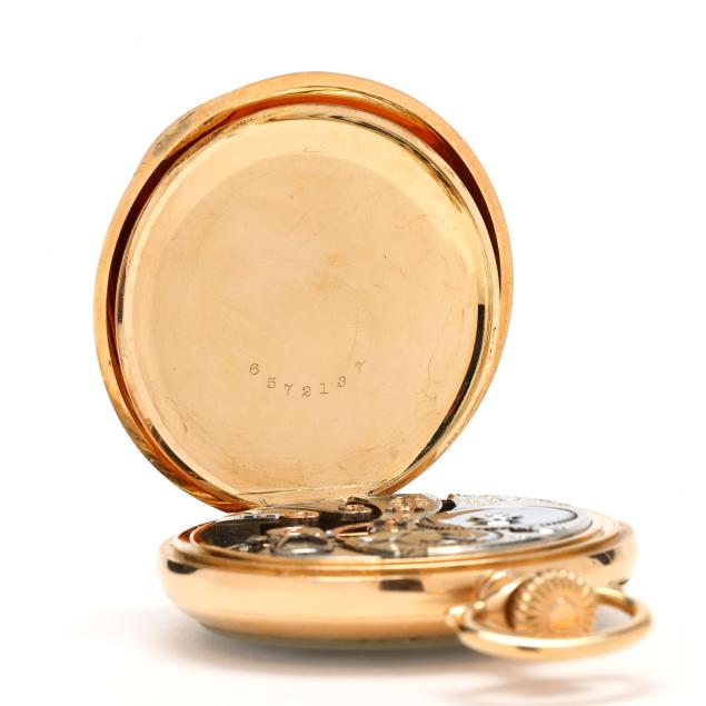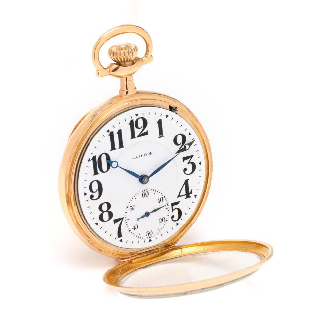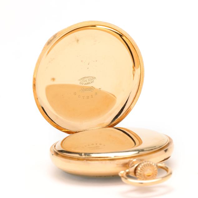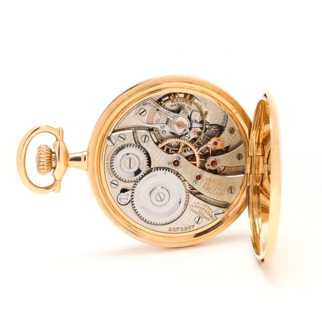 Circa 1913, lever set and stem wind, twenty-three jewels, grade Sangamo Special, serial number 2575927, the gold open face case with polished bezel, back, and caseband, the signed white dial with black Arabic numeral hour markers, blued steel Breguet hands, and subsidiary second dial at 6:00 hour, the movement signed and numbered, the case with markings for Brooklyn Watch Case Co., numbered 6572137 and stamped Warranted / 14K / To Assay.