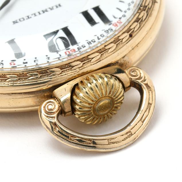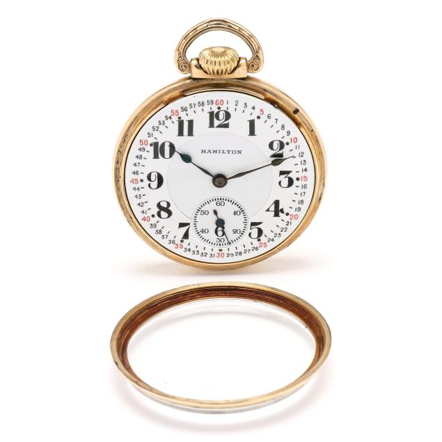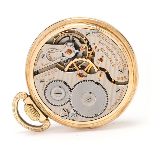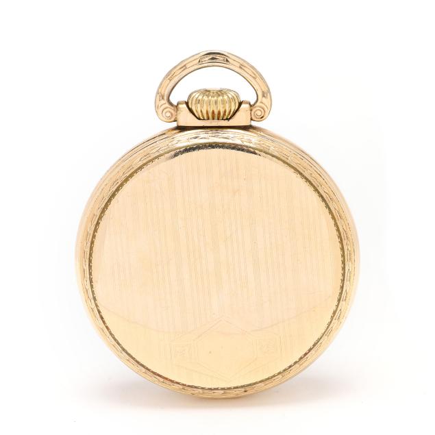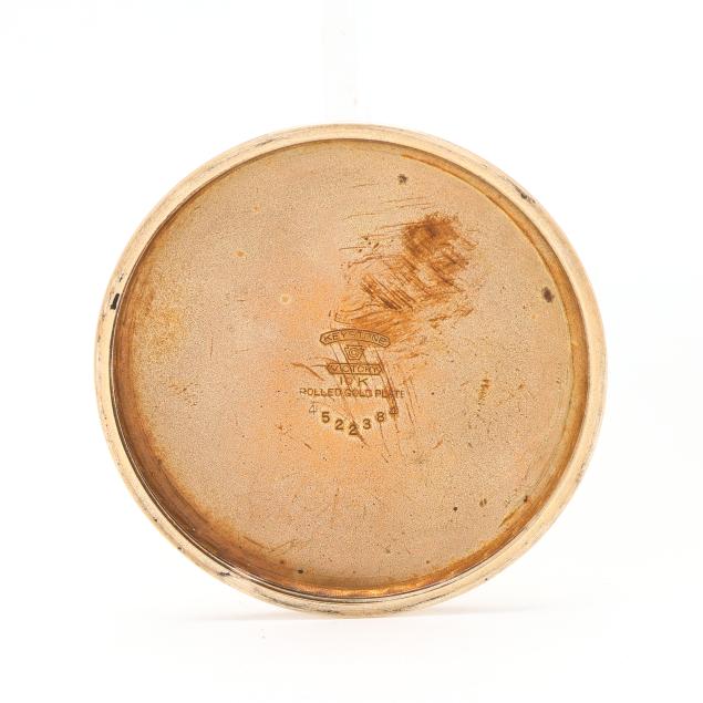 Circa 1924, lever set and stem wind, twenty-one jewels, grade 992, serial number 1746335, the gold-plated open face case with foliate motif surround and cartouche to reverse, the signed white dial with black Arabic numeral hour markers, black and red Arabic numeral outer minute register, black spade hands, and subsidiary second dial at 6:00 hour, the movement signed and numbered, the case with markings for Keystone Watch Case Co., Victory grade, numbered 4522384, and stamped 10K / Rolled Gold Plate.