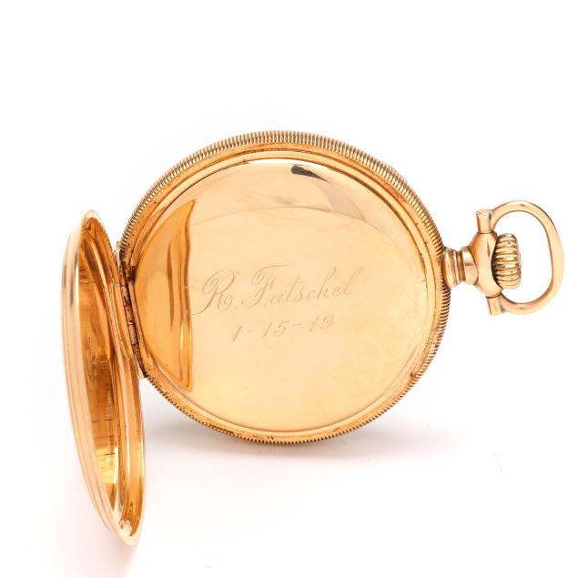 Circa 1909, stem set and wind, seventeen jewels, grade 974, serial number 735069, the gold open face case with polished bezel, engine turned back with center engraved "Robert / Fatschel", and coin edge case band, the signed white dial with black Arabic numeral hour markers, red Arabic numeral outer minute register, blued steel Breguet hands, and subsidiary second dial at 6:00 hour, the movement signed and numbered, the case with marks for Keystone Watch Case Co., numbered 4556974, and stamped Warranted / 14K / U.S. Assay, the cuvette with engraving "R. Fatschel / 1-15-19".