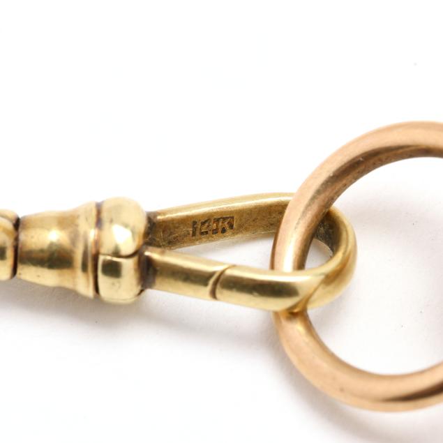 Key set and wind, serial number 107549, the gold open face case with floral, foliate, swirl, and key motifs, with black and blue enameled accents, and with center cartouche, the white dial with black Roman numeral hour markers, black Arabic numeral outer minute register, and black diamond hands, the case numbered 107549, cuvette signed and testing base metal, outer case testing 14KT, key present. The bar link watch chain with black enameled detailing, completed with spring ring and lobster clasps, stamped and testing 14KT.