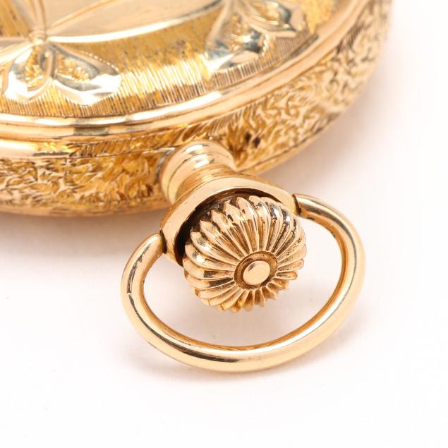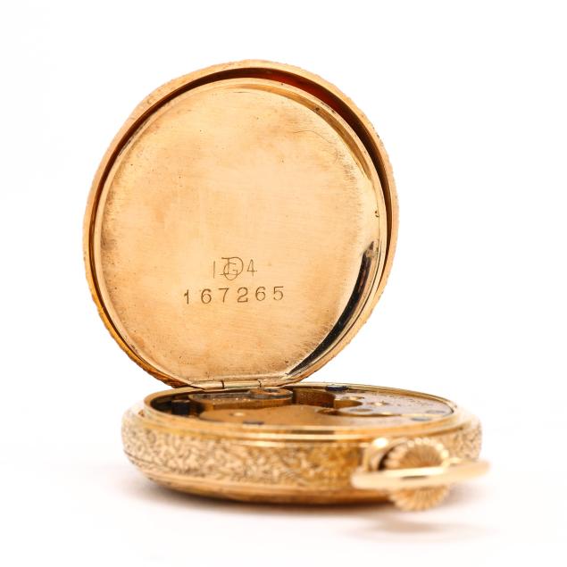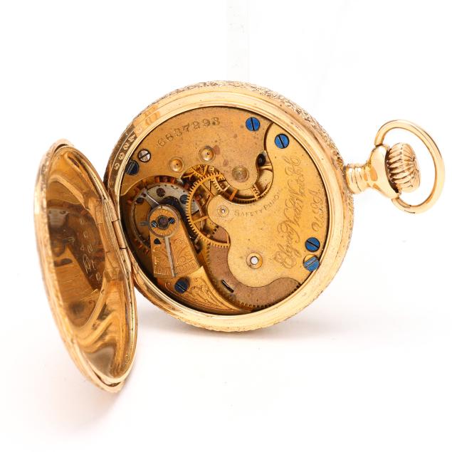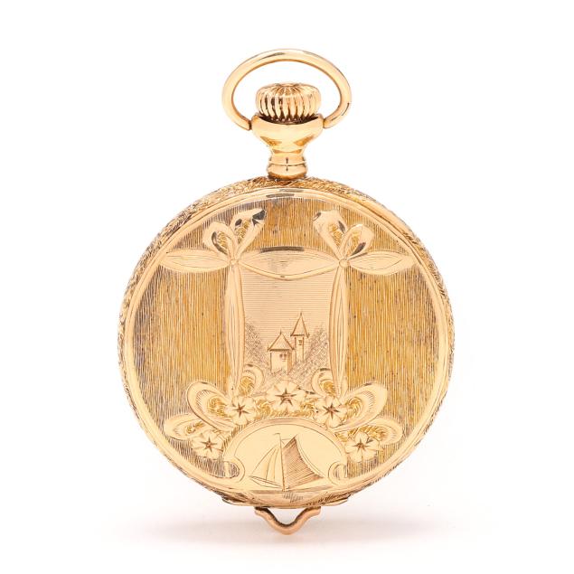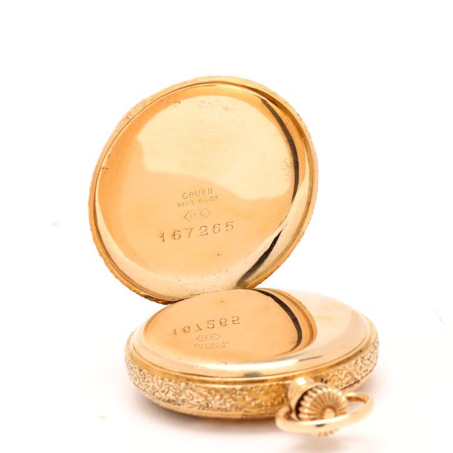 Circa 1897, stem set and wind, seven jewels, grade 109, serial number 6637293, the gold hunting case with foliate and floral motif, window with village scene, sailboat, and monogram, all over textured ground, the signed white dial with black Arabic numeral hour markers, red Arabic numeral minute register, blued steel spade hands, and subsidiary second dial at 6:00 hour, the movement signed and numbered, the case with marks for Gruen National Watch Case Co., numbered 167265, and stamped 14KT.