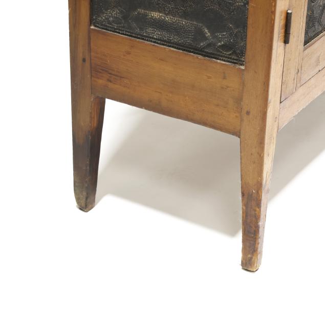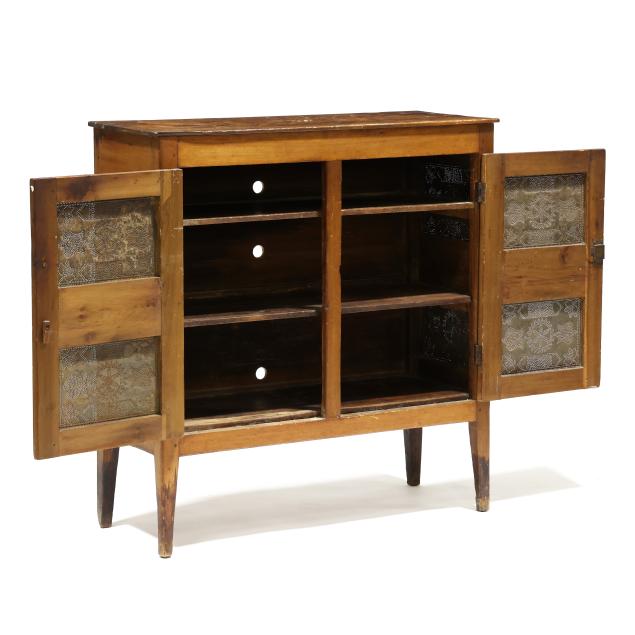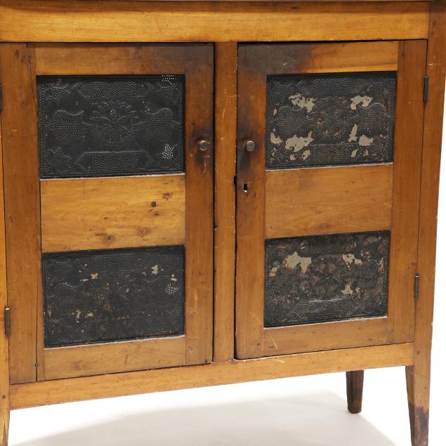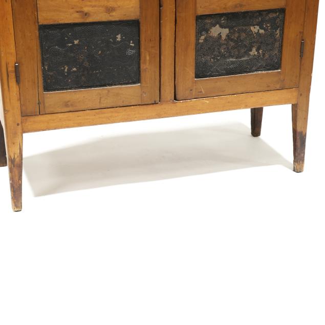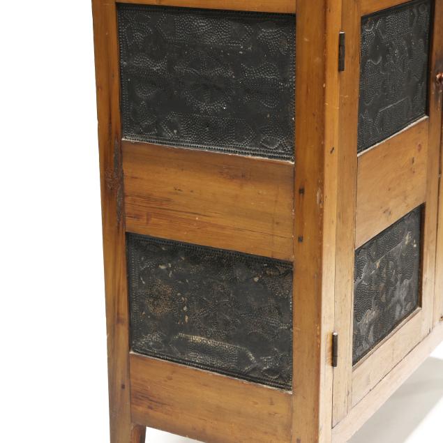 Late 19th century, wood pegged joinery, two hinged door with two punched tin panels each in a tulip motifs, shelved interior, the side with repeating punched tins, straight tapered legs.