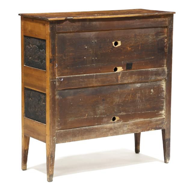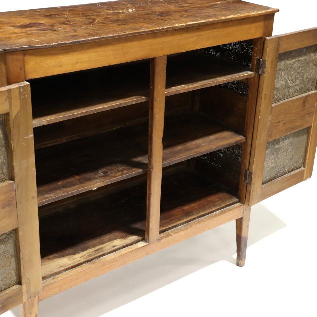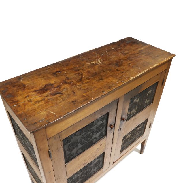 Top reset and with dark staining, wear and shrinkage cracks; punched tins are old and appear original with flaking black paint; left cabinet door with cracks to door frame near hinges; back boards with three later drilled holes.