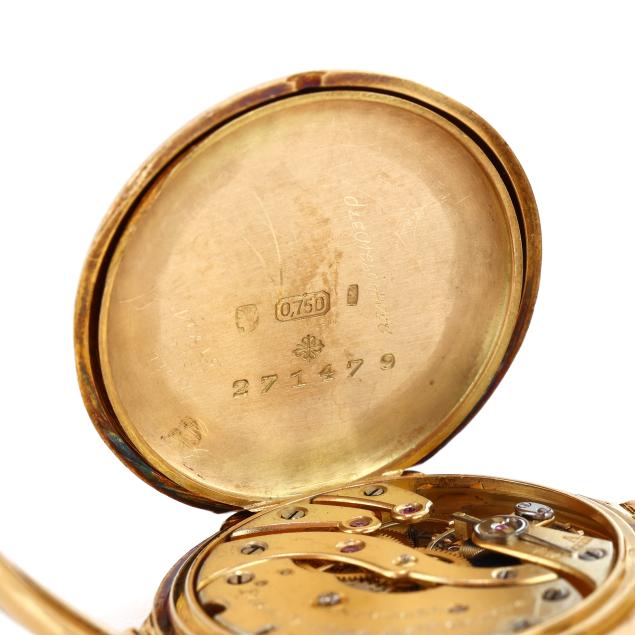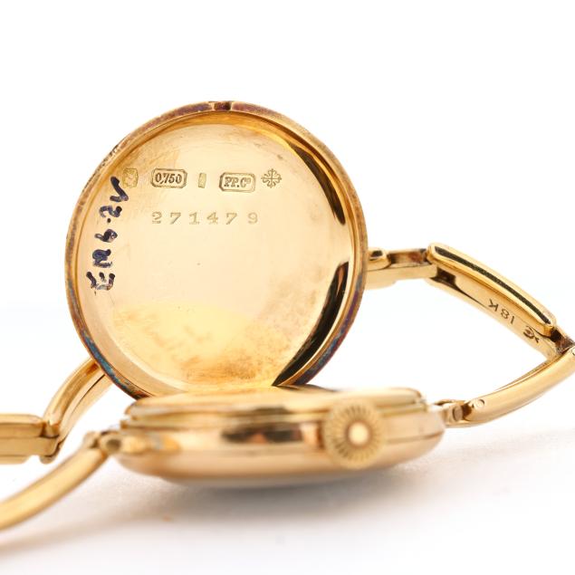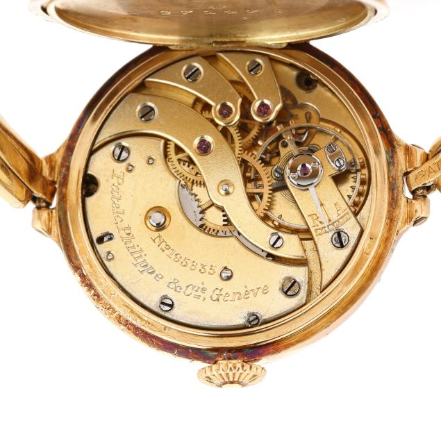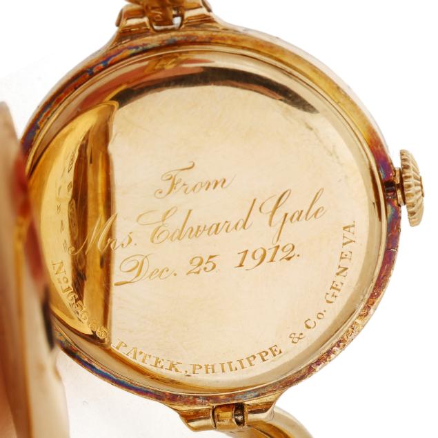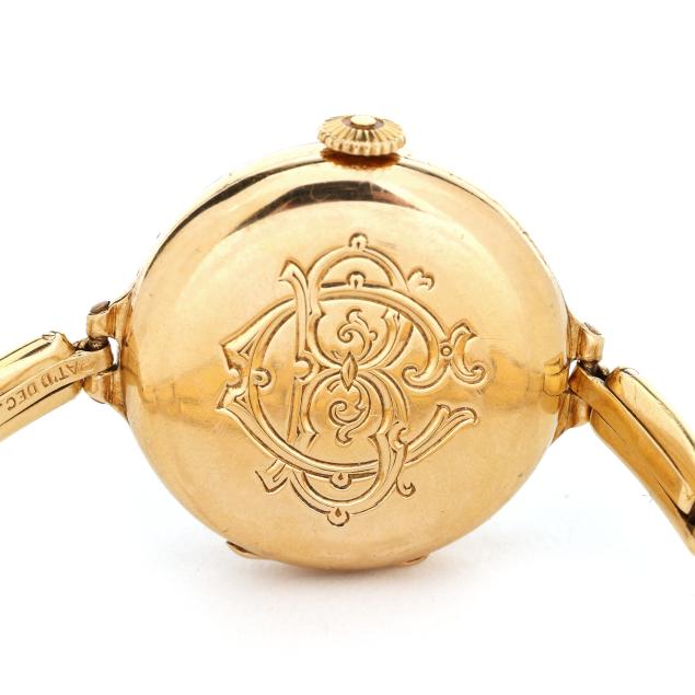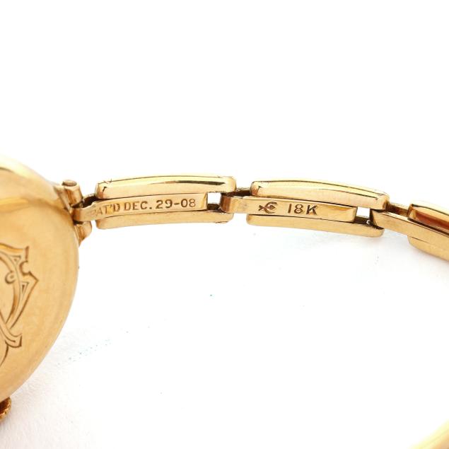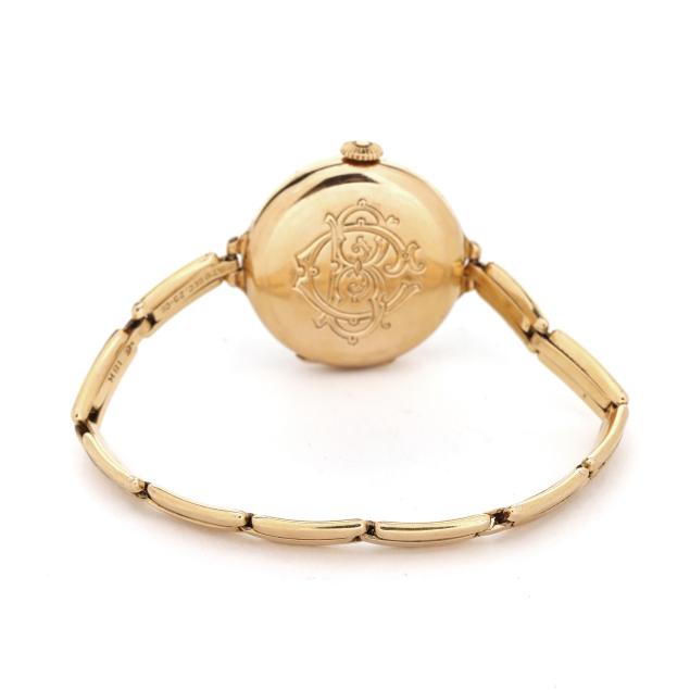 Circa 1912, manual wind, caseback number 271479, movement number 165635, the round gold case with polished bezel, the signed white dial with black Arabic numeral hour markers and blued steel spade hands, the gold stretch band stamped with a maker's mark and 18K, the caseback with monogram, interior with maker's marks, numbered, and Swiss hallmarks for 18KT, cuvette signed, numbered, and with presentation engraving "From / Mrs. Edward Gale / Dec. 25 1912".