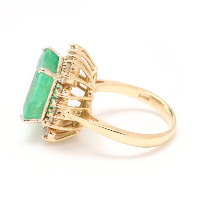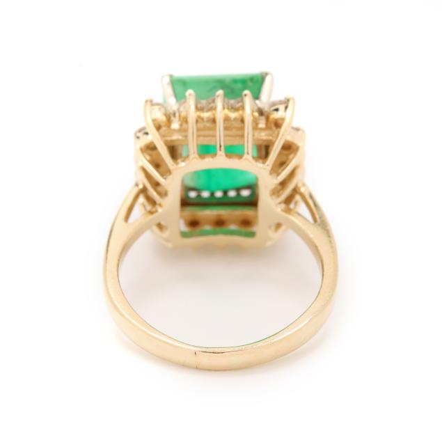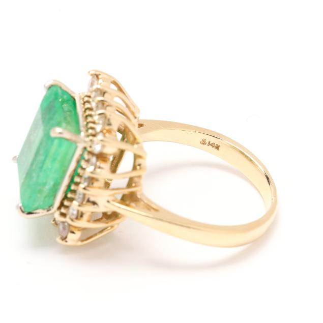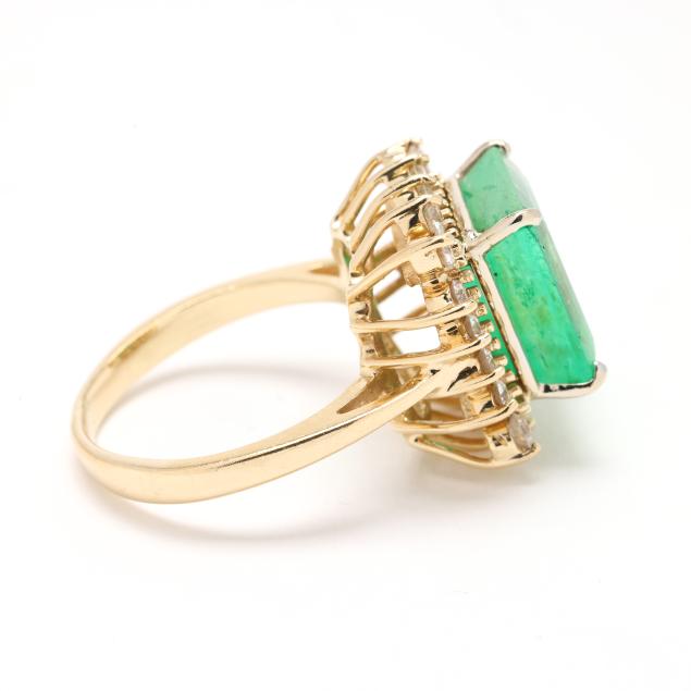 Centered on an emerald cut emerald (12.6 x 10.0 x 6.3mm) weighing approximately 5.50 carats set in a frame of full cut round diamonds weighing approximately .72 total carat (I-J color, SI1-SI2 clarity), stamped 14K.
